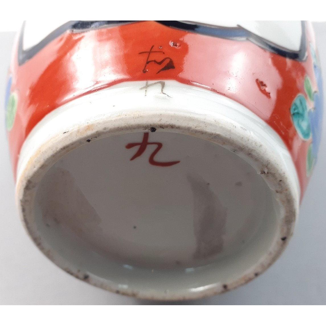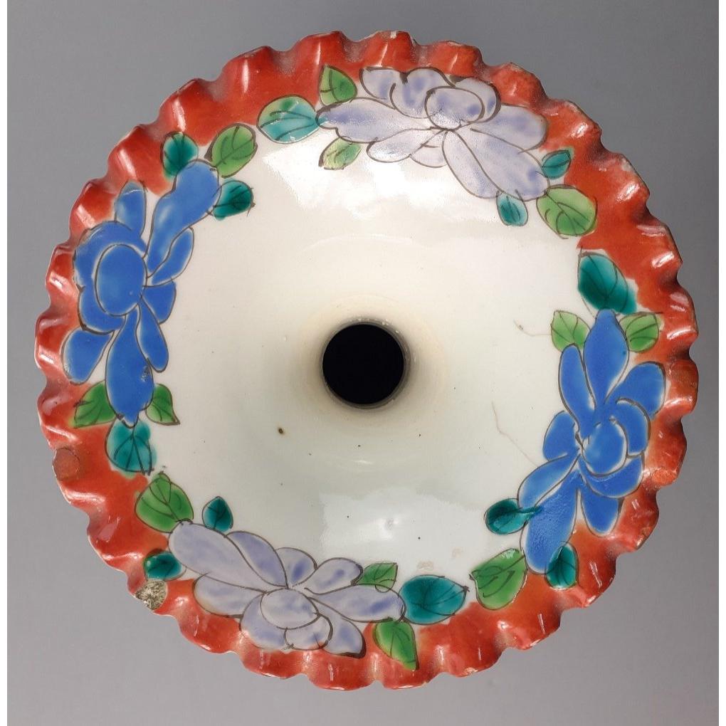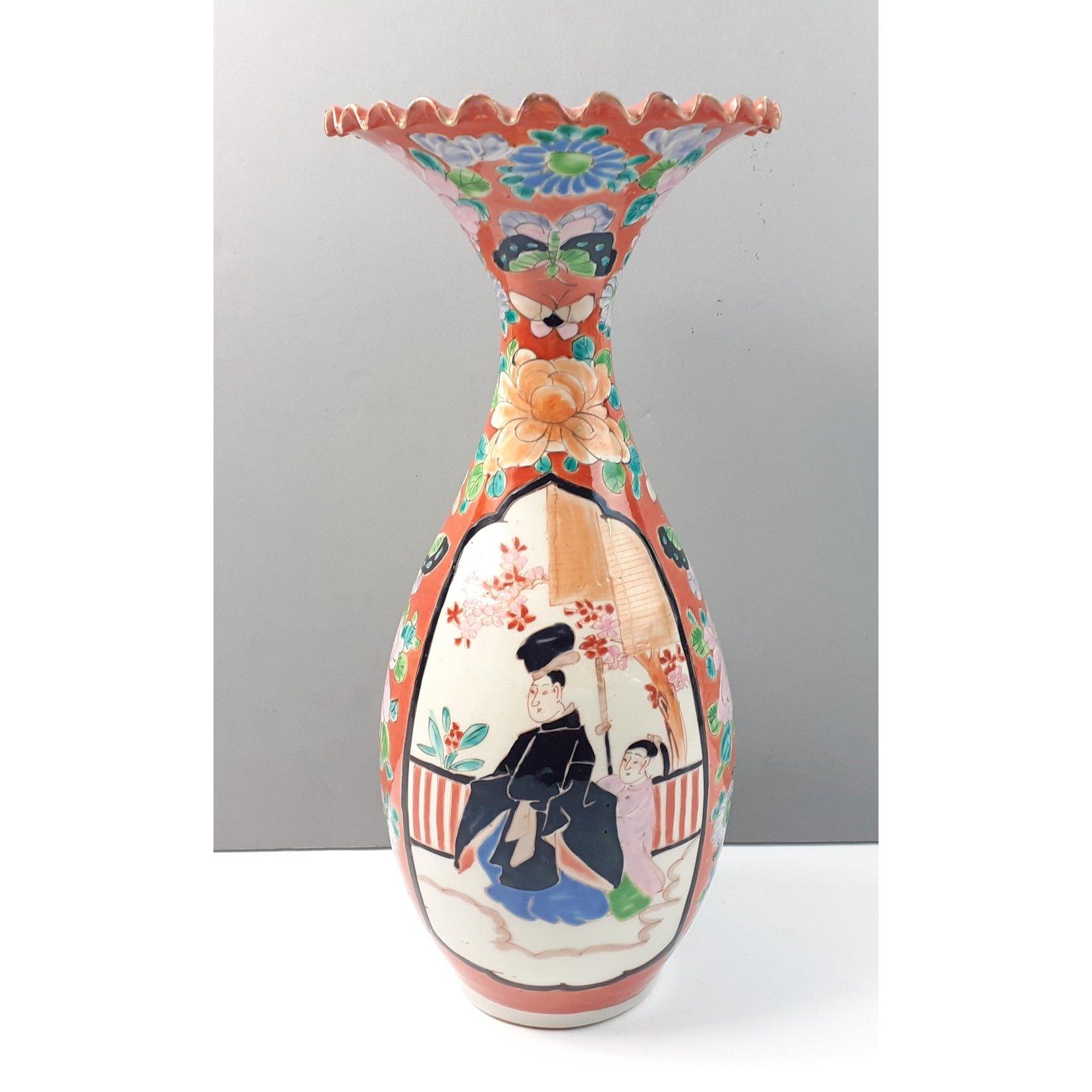 A trumpet shape, JAPANESE IMARI style vase with a decorative scalloped edge top. Four panels, hand painted in enamel on an authentic base colour of iron red with gilt highlights. Two show 2 figures: a man standing in traditional dress and one behind. The background is a garden with trees and cherry blossom. The other two are of colourful butterflies and chrysanthemums in shades of blue, pinks and orange. Stands approx 30cm with no damage