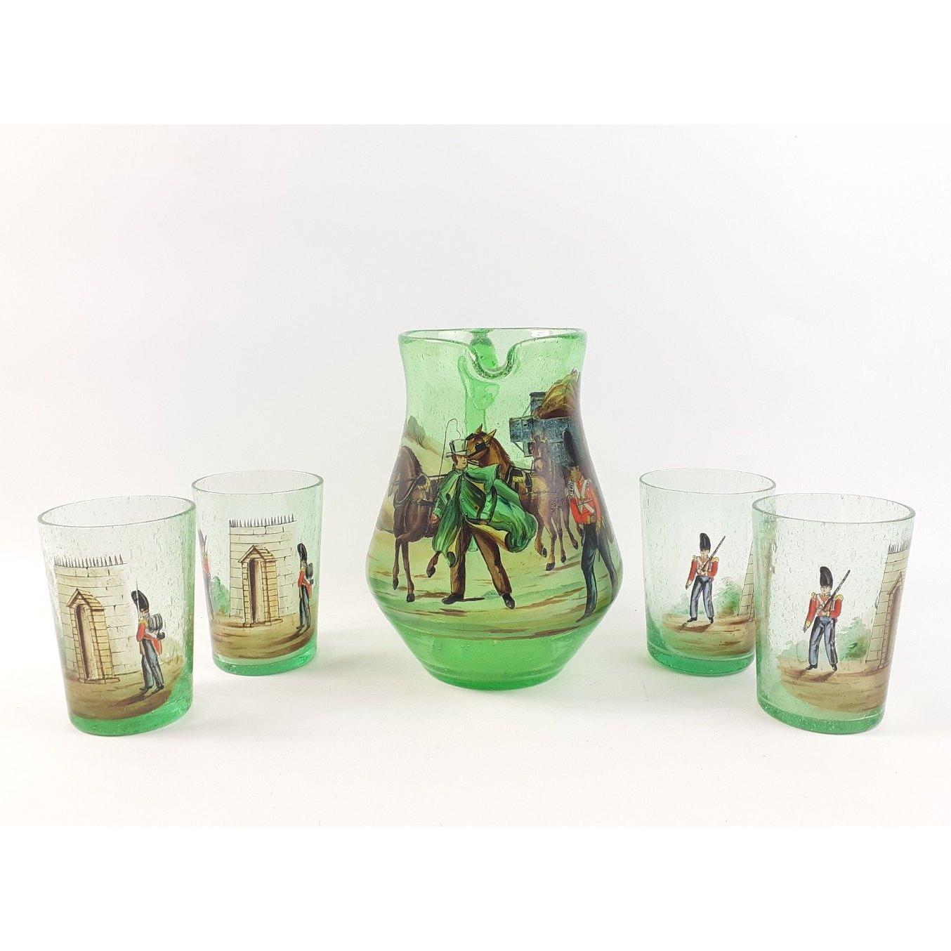 A set consisting of a hand-painted green glass water jug and 4 glasses, the jug decorated with a scene of a 19th century stagecoach and sentries and the glasses each with 2 sentries Approx 5 pieces