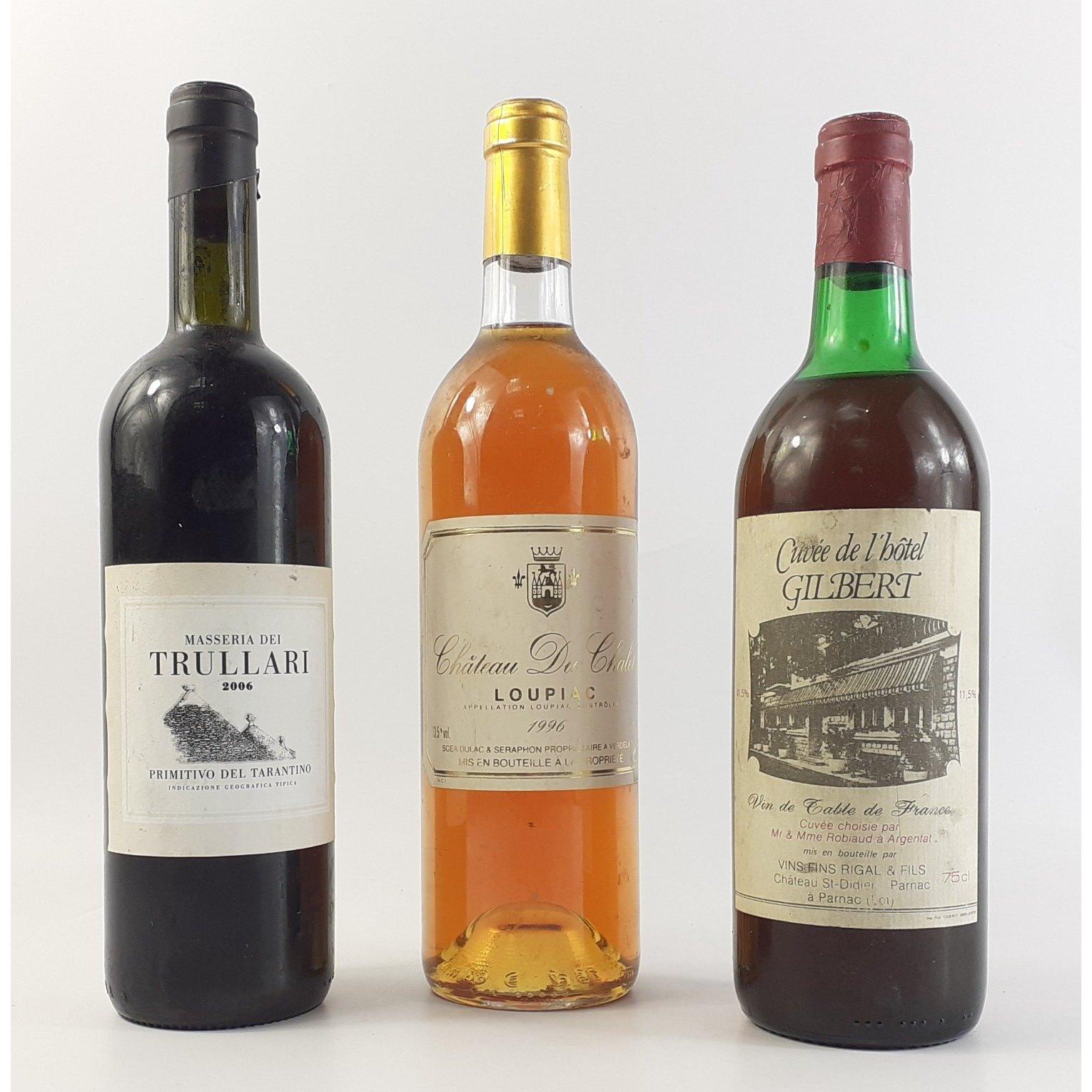 A bottle of 2006 Racemi Masseria dei Trullari Primitivo del Tarantino IGT red wine, a 1996 Chateau du Chalet, Loupiac, France dessert wine and a Cuvee de L'hotel Gilbert table wine