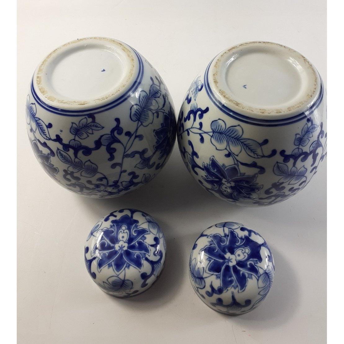 A pair of attractive oriental lidded blue and white ginger jars. Each standing 20cm tall approx and in good condition.Approx 2 pieces
