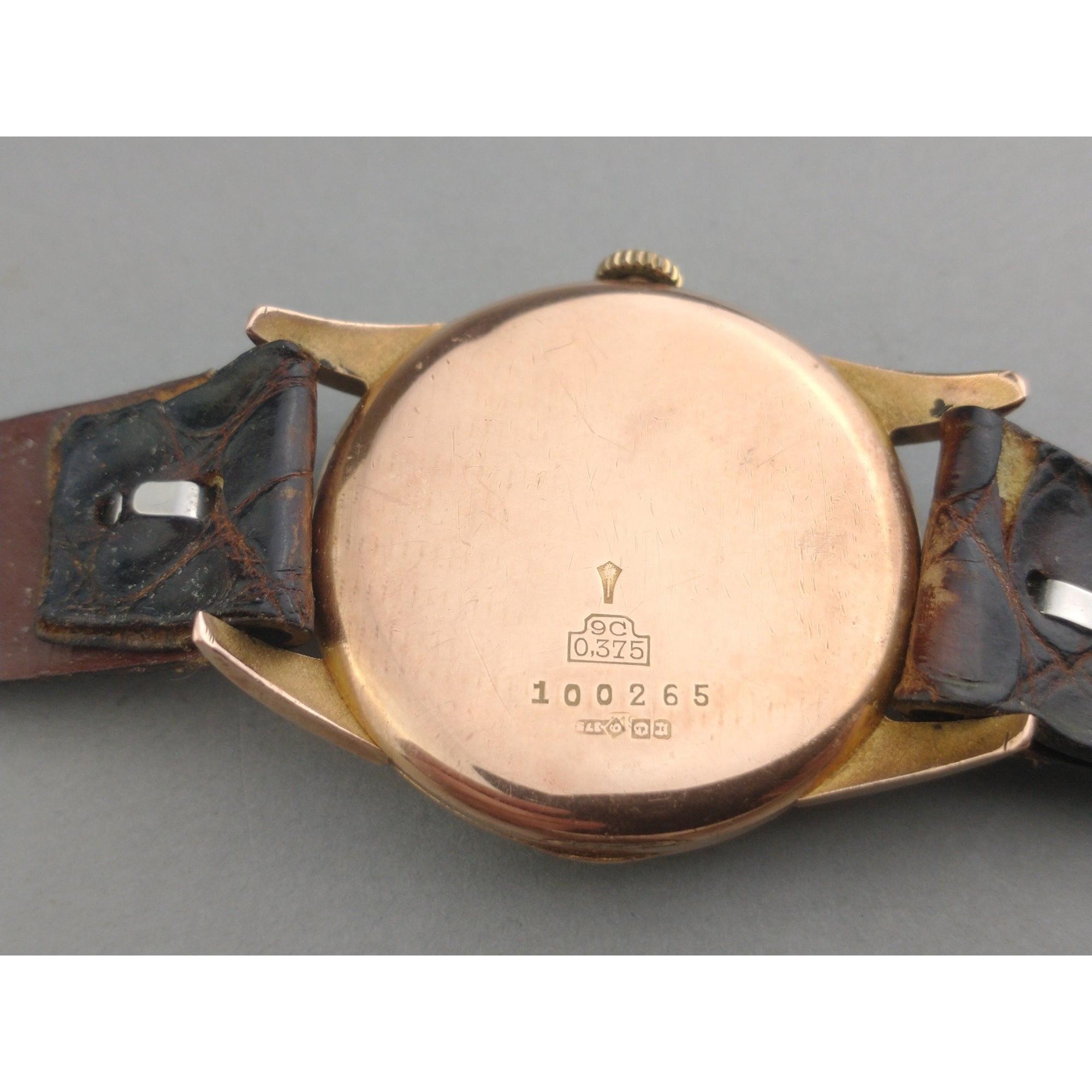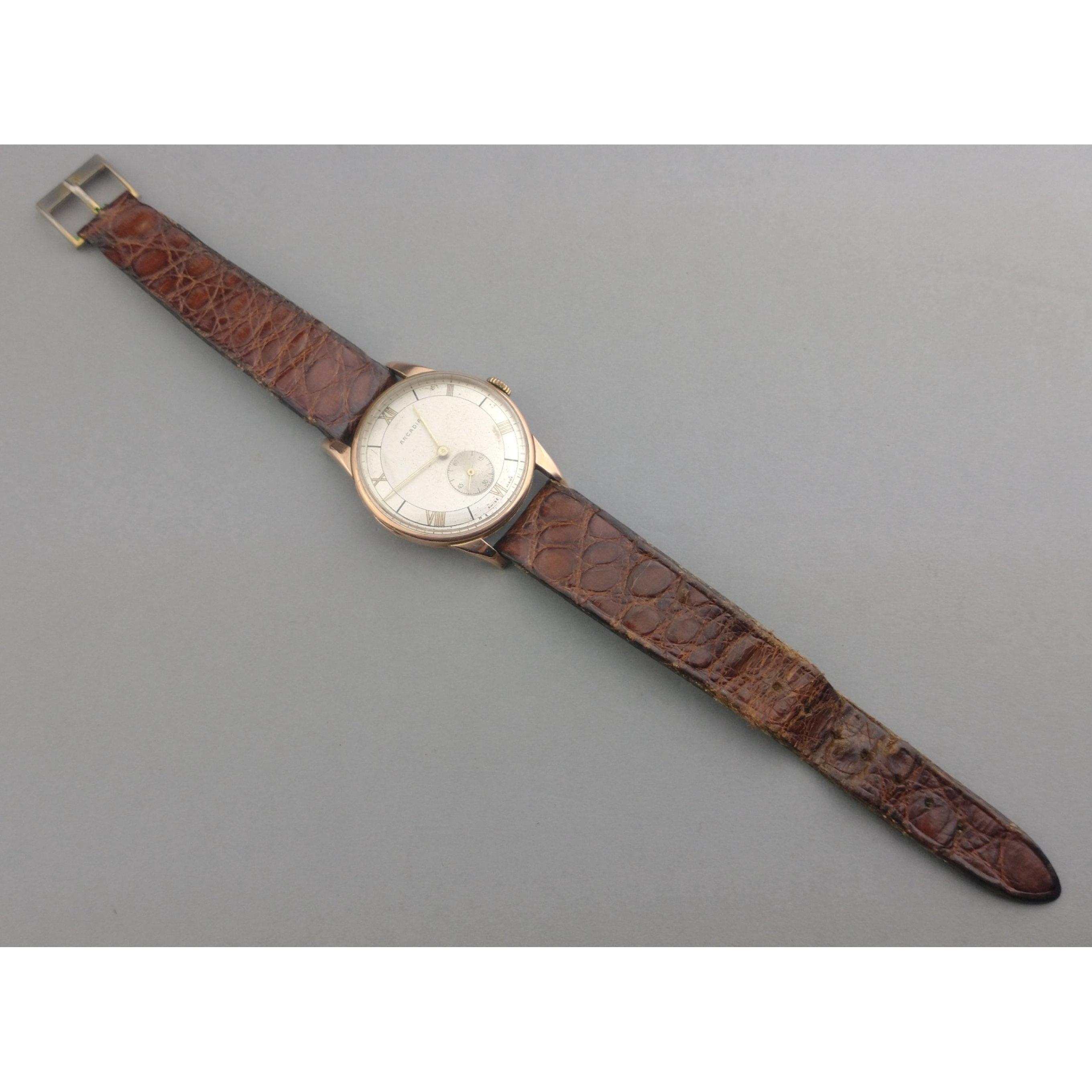 A classic Gent's Swiss Made ARCADIA watch with 9ct gold stamped case. Face diameter 29mm approx. Second hand sub dial. Appears to work well with a gentle wind.