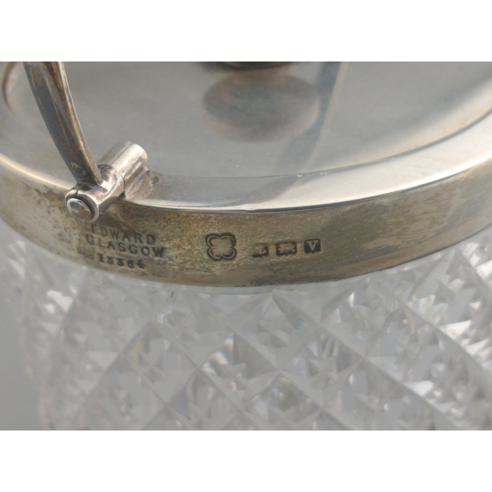 A very pretty Edward of Glasgow crystal biscuit barrel with silver hallmarked collar, lid and handle. Hallmarks for Birmingham 1920.