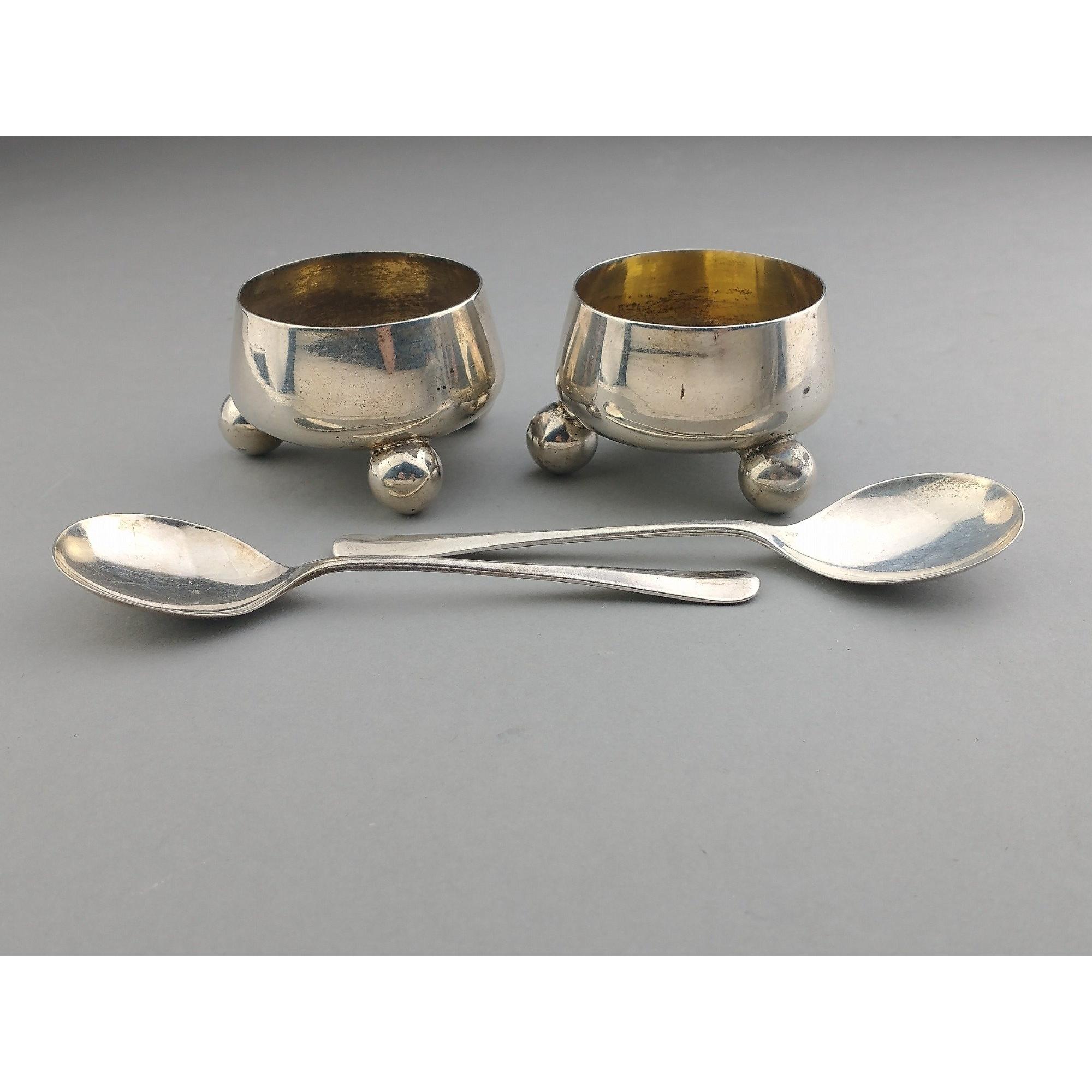 Two lovely silver hallmarked salts with EXETER young head Victorian hallmarks 1878 by Josiah Williams & Co. Weight 80g approx. with two Birmingham hallmarked spoons weighing 30g approx. Approx 4 pieces