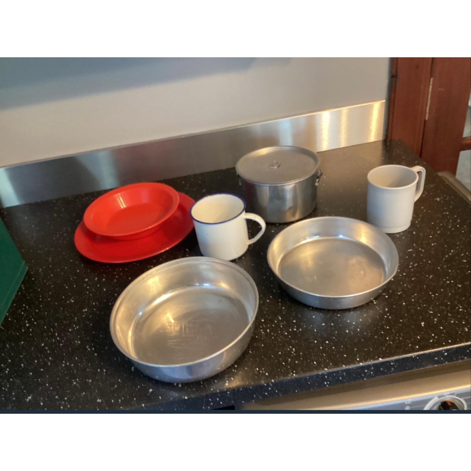 A camping collection to include A VANGO ODYSSEY 300 two man tent with self-inflating mattress, cooking equipment with Taymar gas camping stove. Sleeping bag and pillow with Buffalo wind shirt size 44.