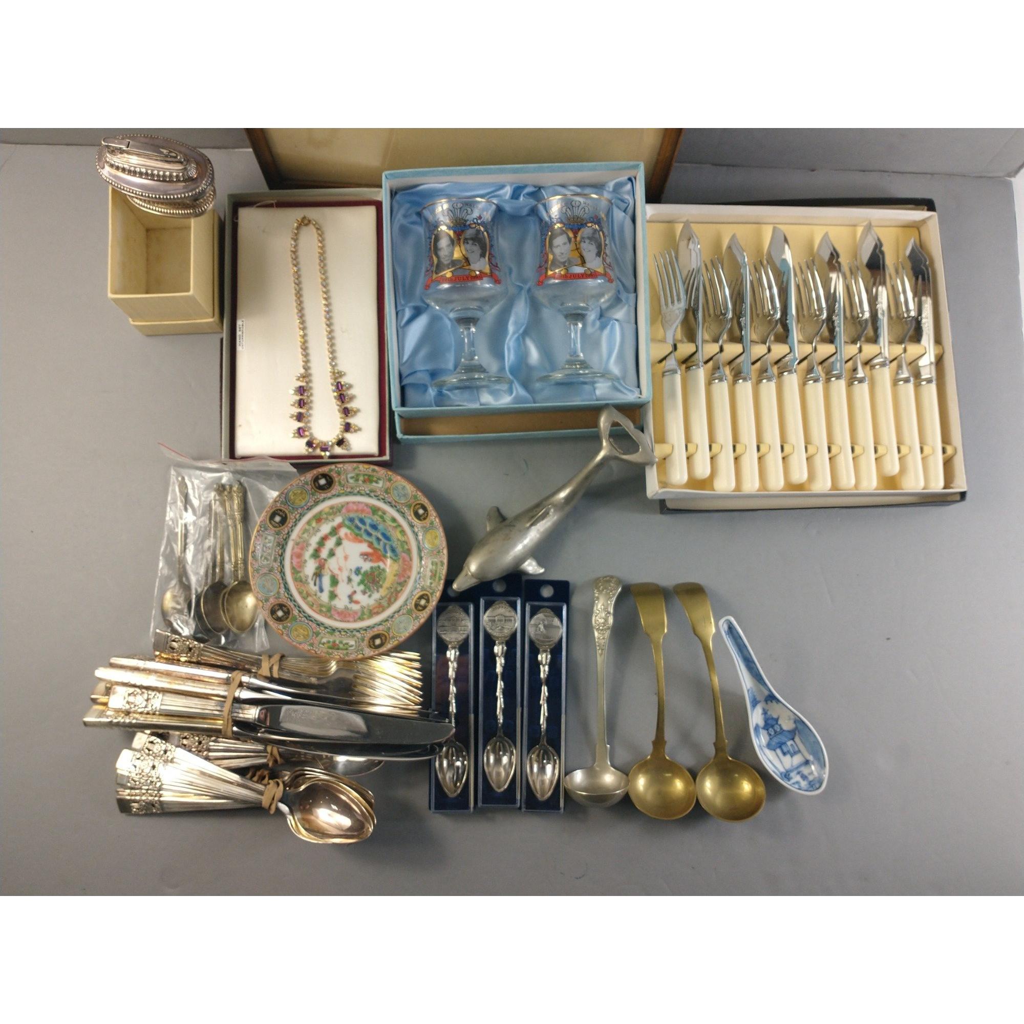 A mixed lot to include a BRIGHT knife and fork set, bag of plated cutlery, 6 apostle spoons, commemorative spoons, brass and plated toddy ladles, a Queen Anne RONSON lighter, a dolphin shaped corkscrew, Charles and Diana wedding glasses, a boxed necklace, 2 Oriental plates etc