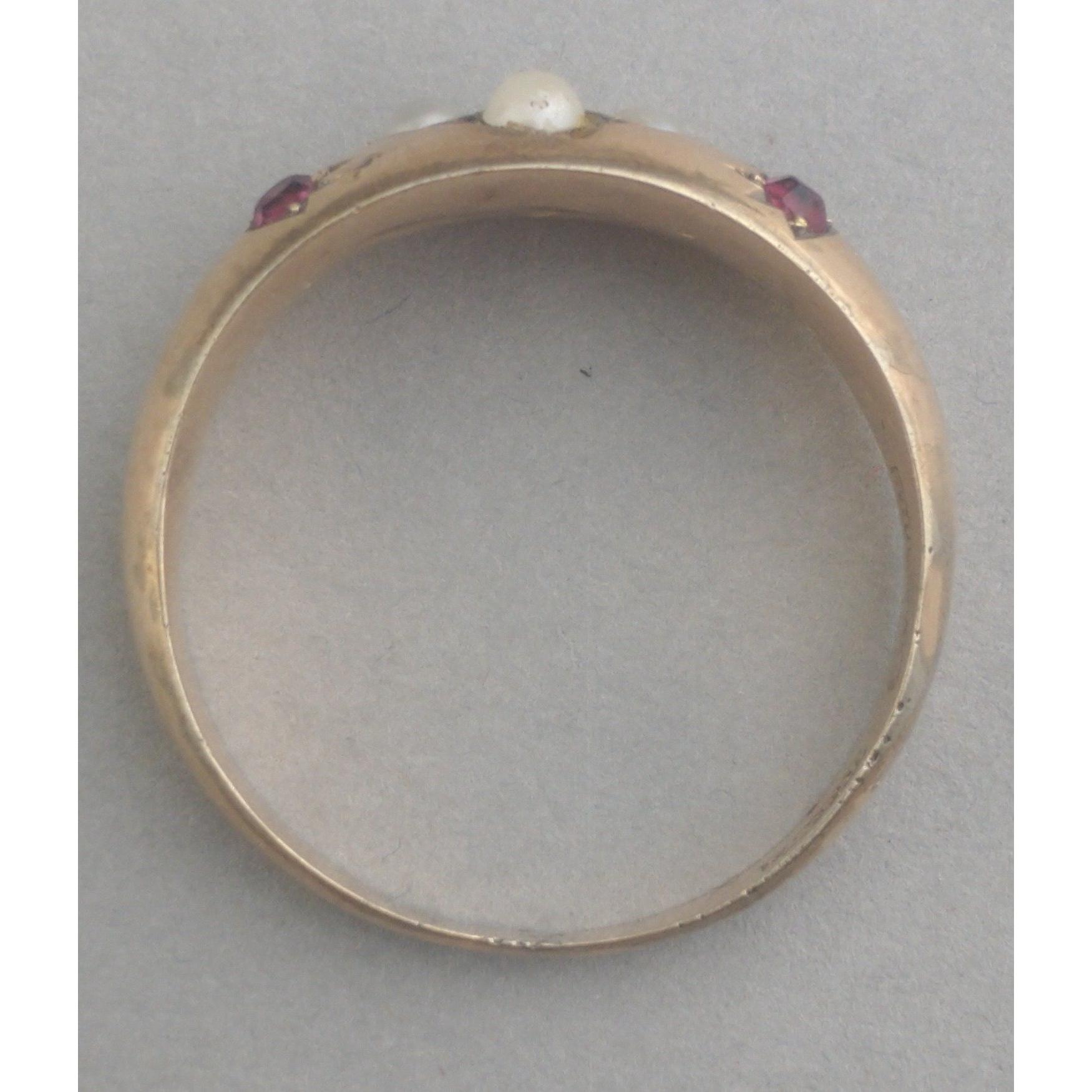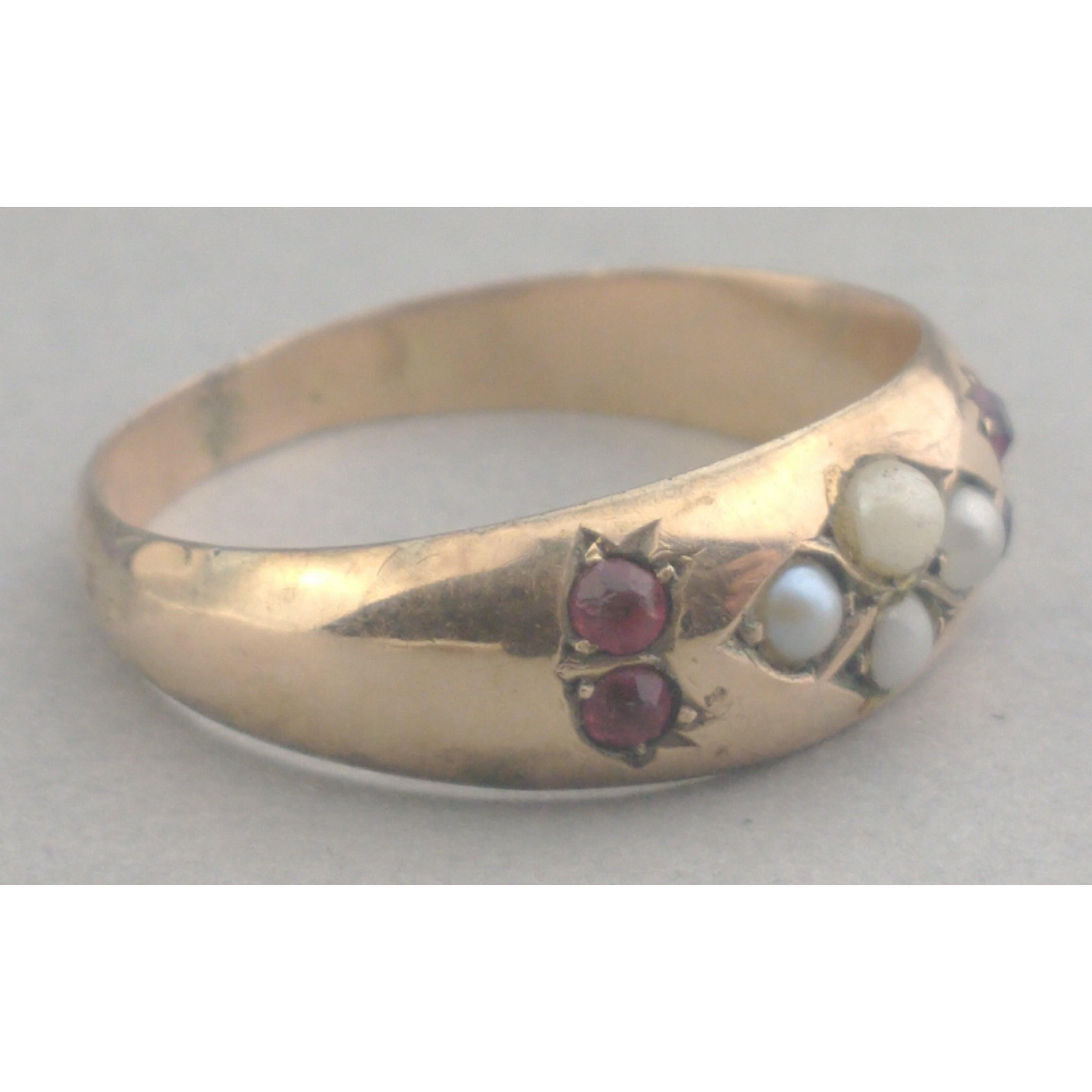 Pretty 9ct stamped gold ring set with red stones and seed pearls. Has been resized. Size Q, gross weight 1.6g approx