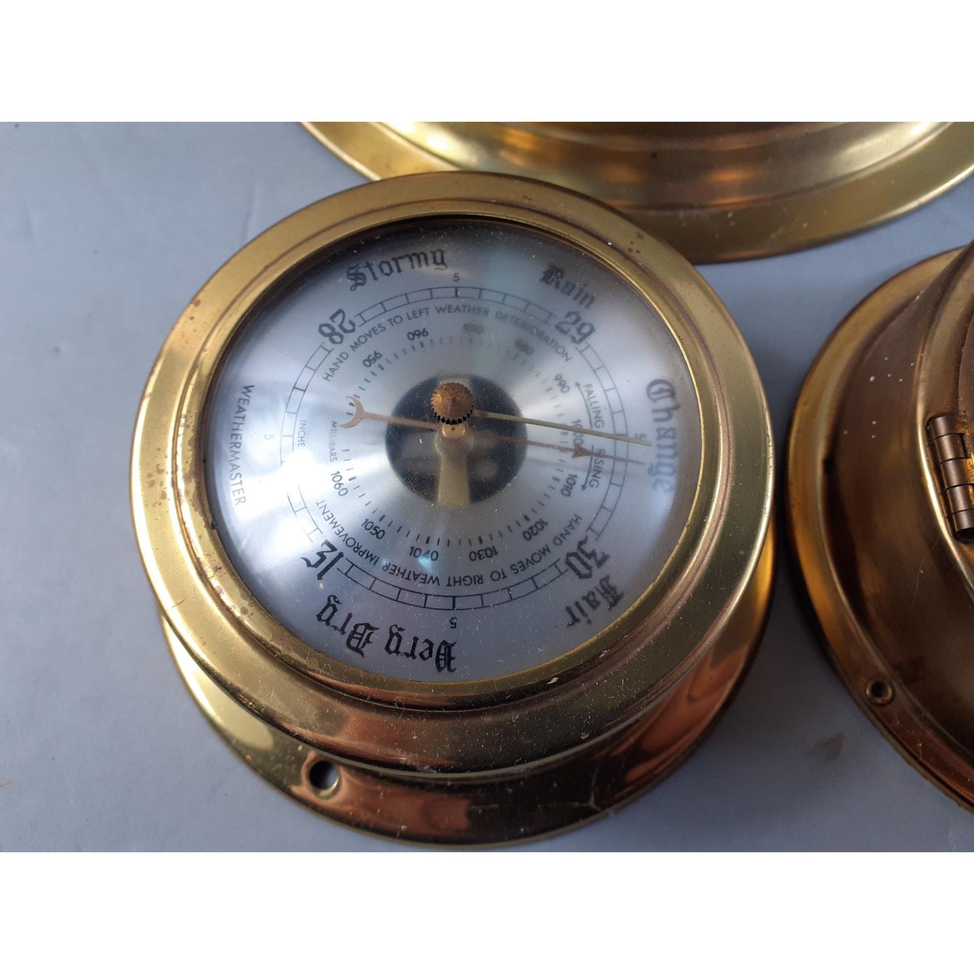 A large brass winding clock (face diameter 20cm), key supplied. Plus one other similar Actim modern clock and a modern Weathermaster plus a GOLIATH pocket with with broken winder