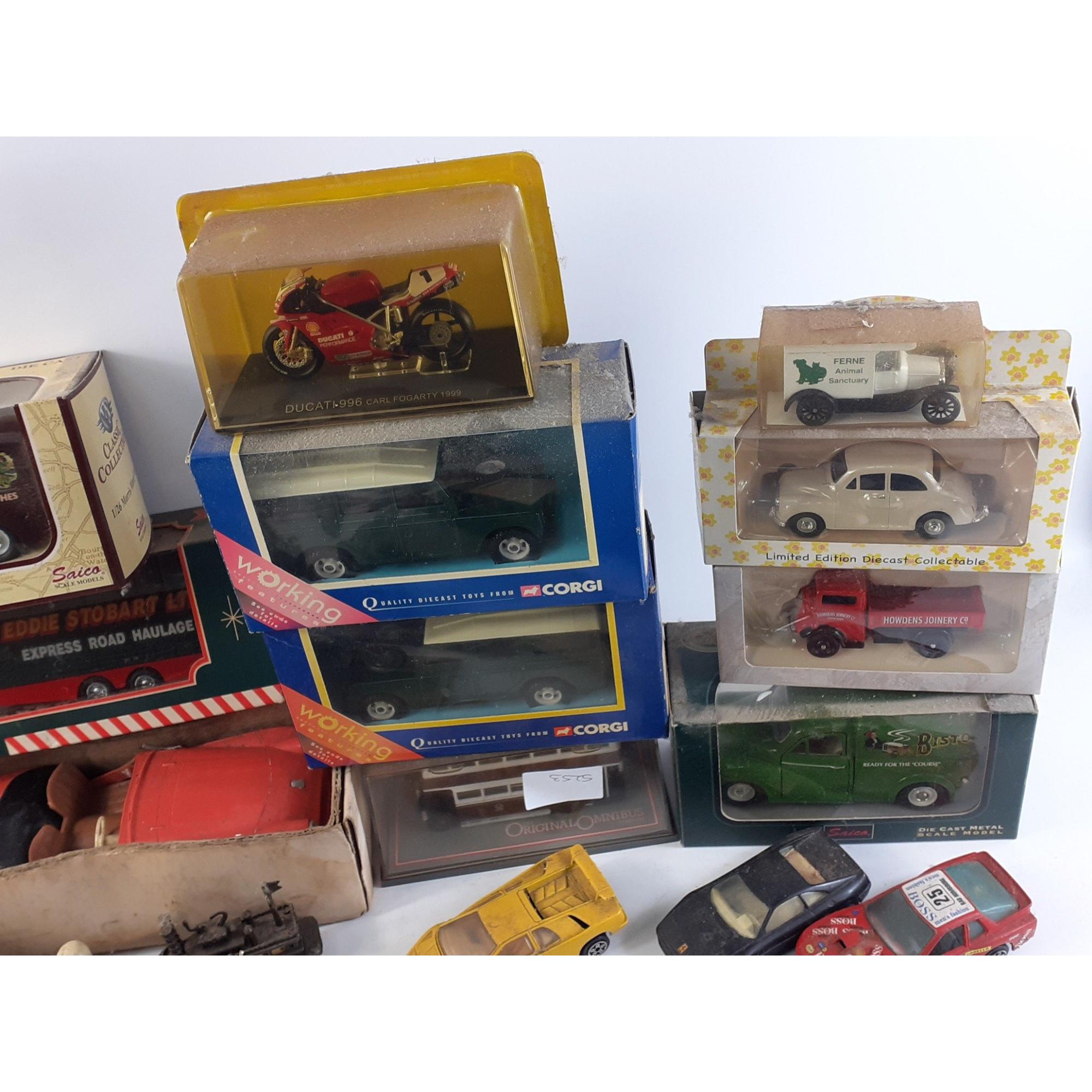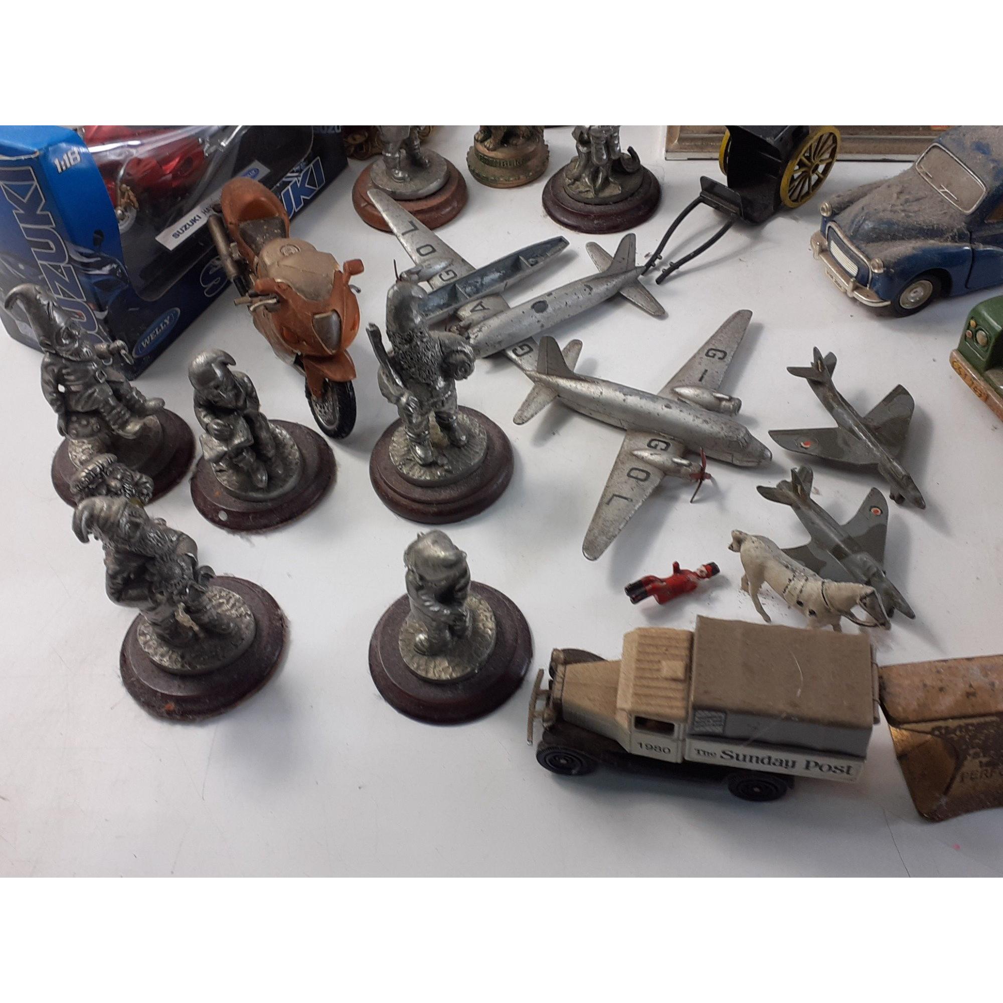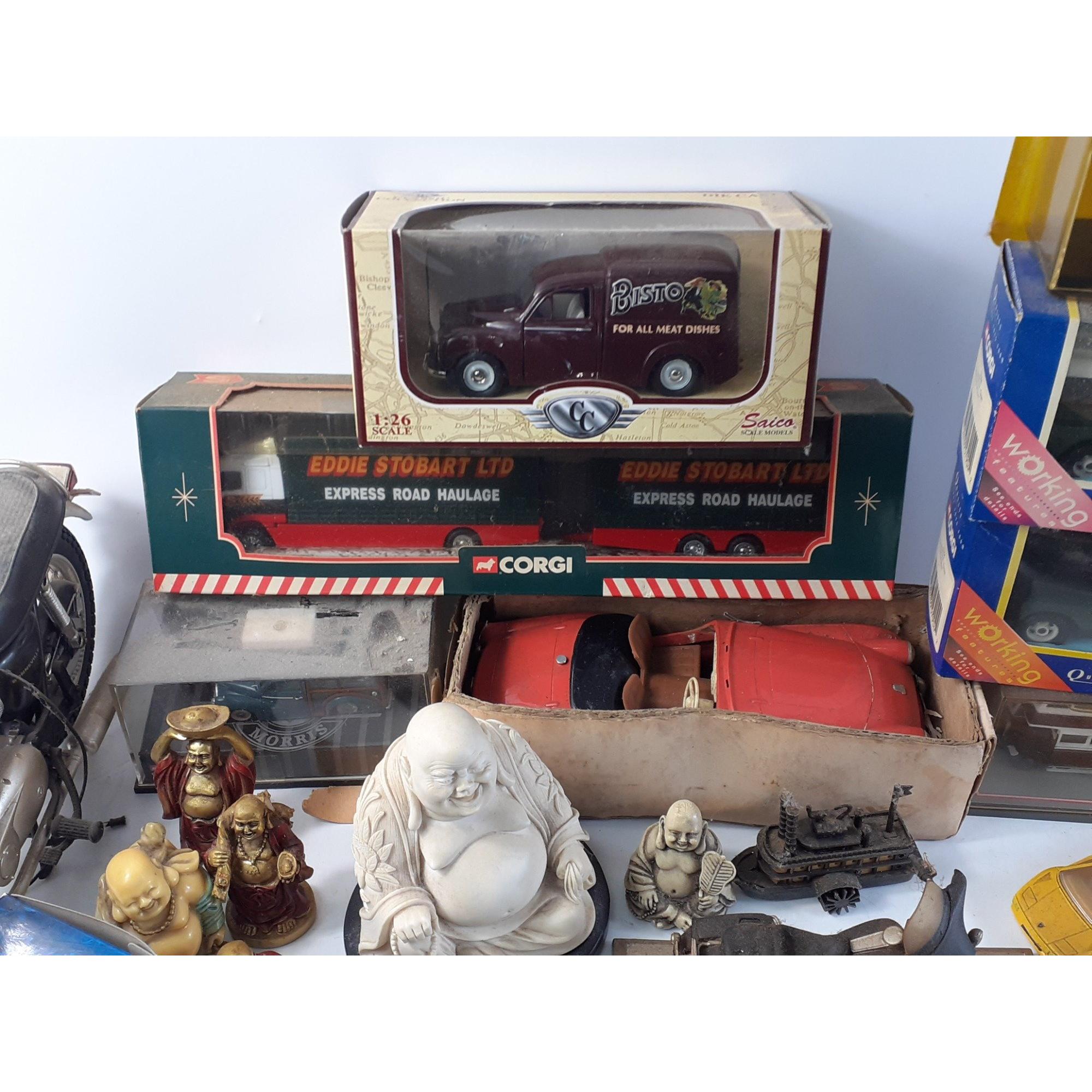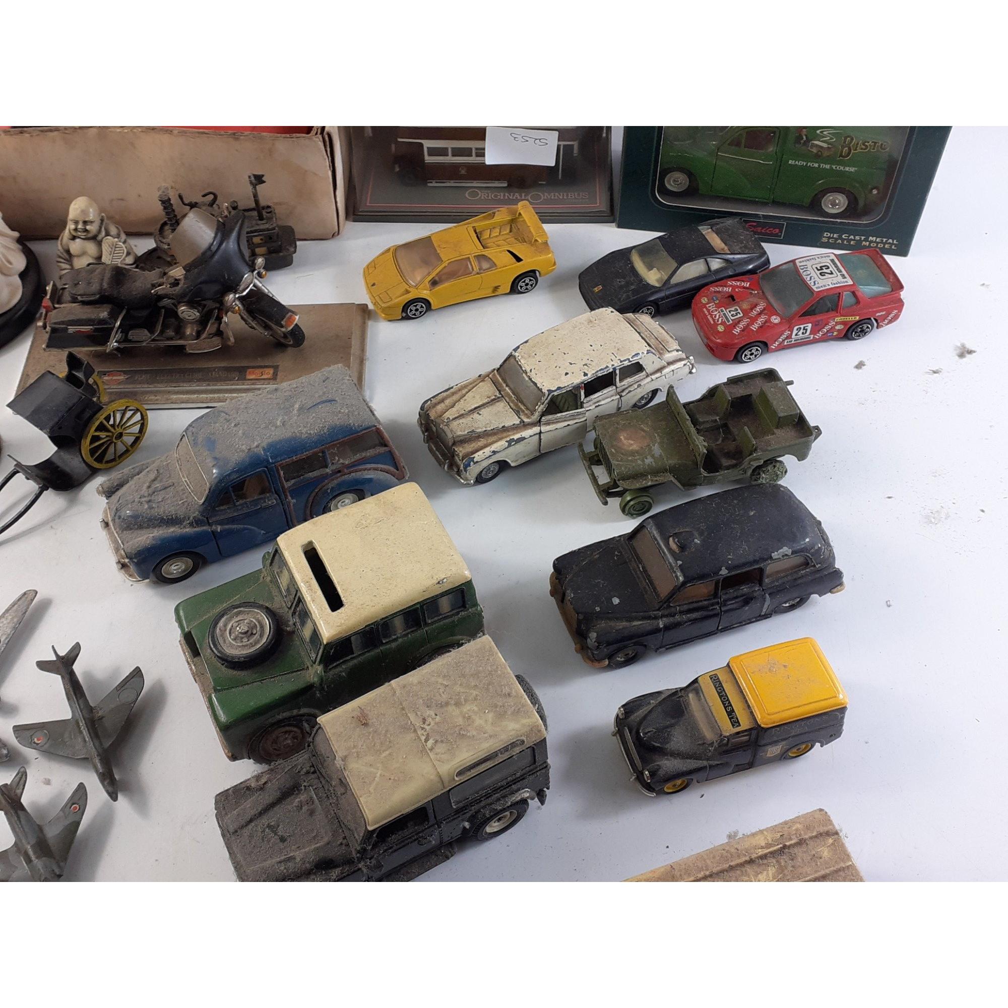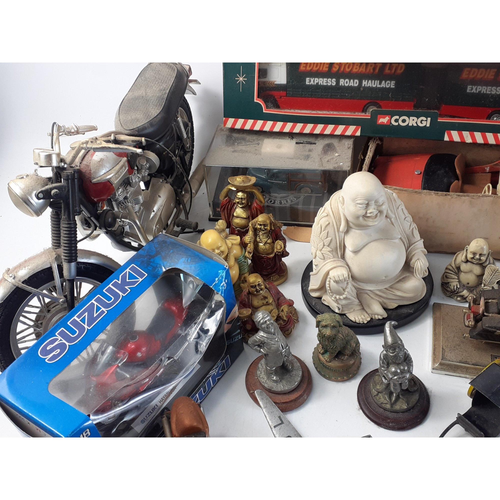 A box of boxed model vehicles and several Buddha figures. Poorly stored.