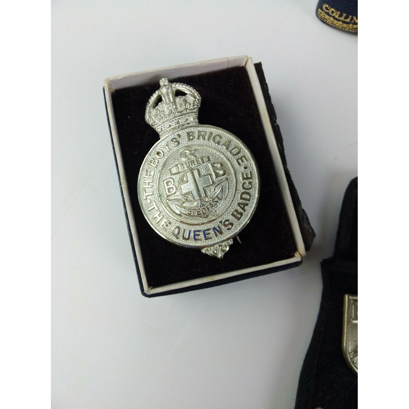 BOYS BRIGADE interest. A super lot of BB badges and Ephemera from 1950s. Great large 6cm badge and other award badges on Corporals patch. Include BB Bible and five prize books.
