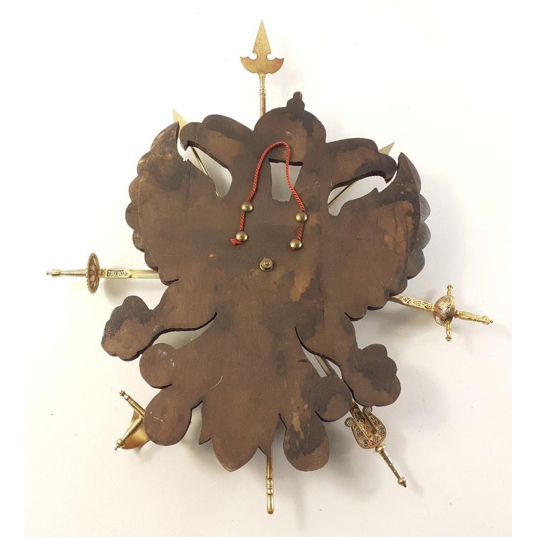 Spanish TOLEDO wooden wall plaque with Toledo marked miniature swords and pike set within hard wood double headed eagle shield. Plaque measures 30cm approx. An interesting, quality piece.