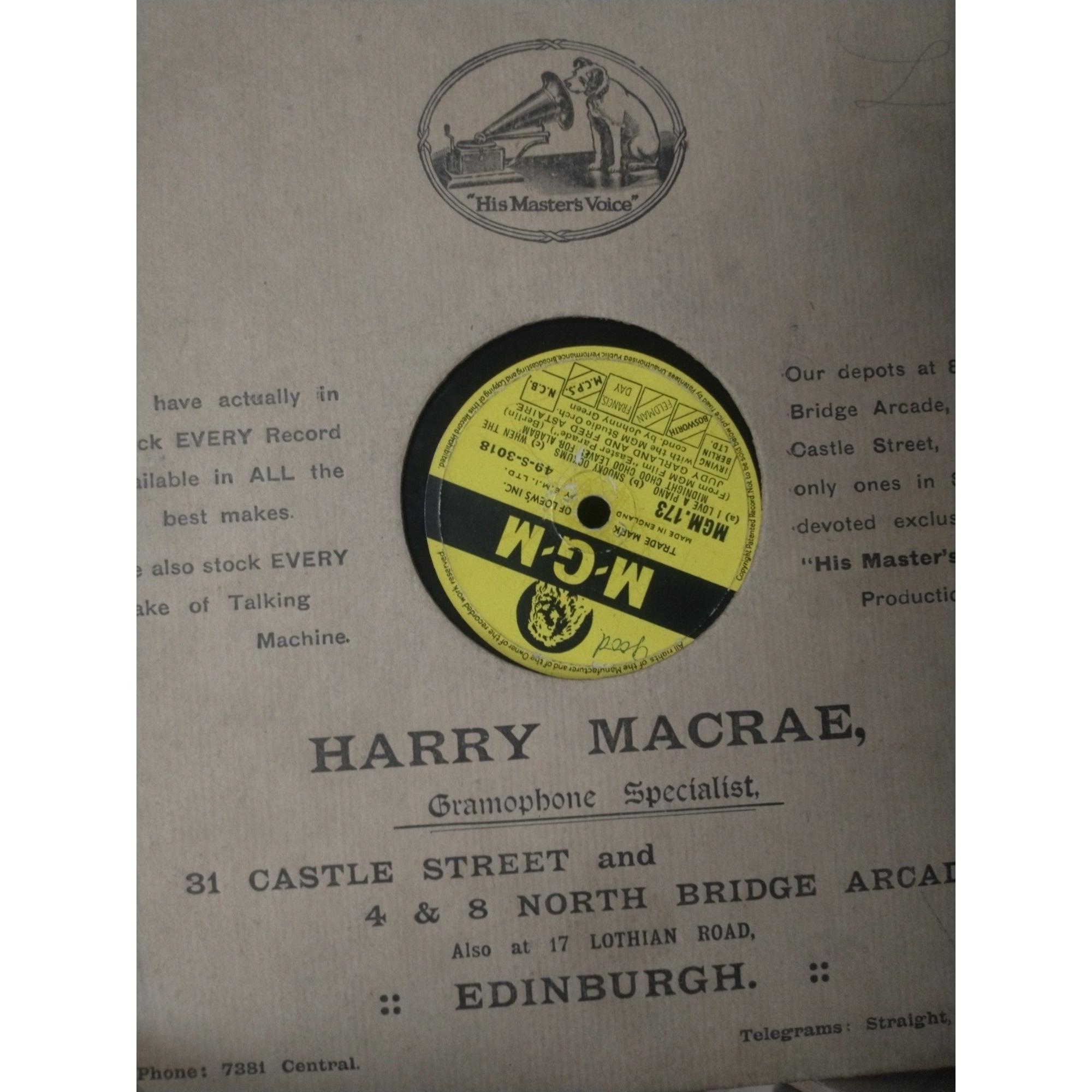 HIS MASTERS VOICE gramophone ltd purchased from 83 Princes St Edinburgh Methuen Ltd - still in working order! - complete with a box of FULL of shellac 78' records