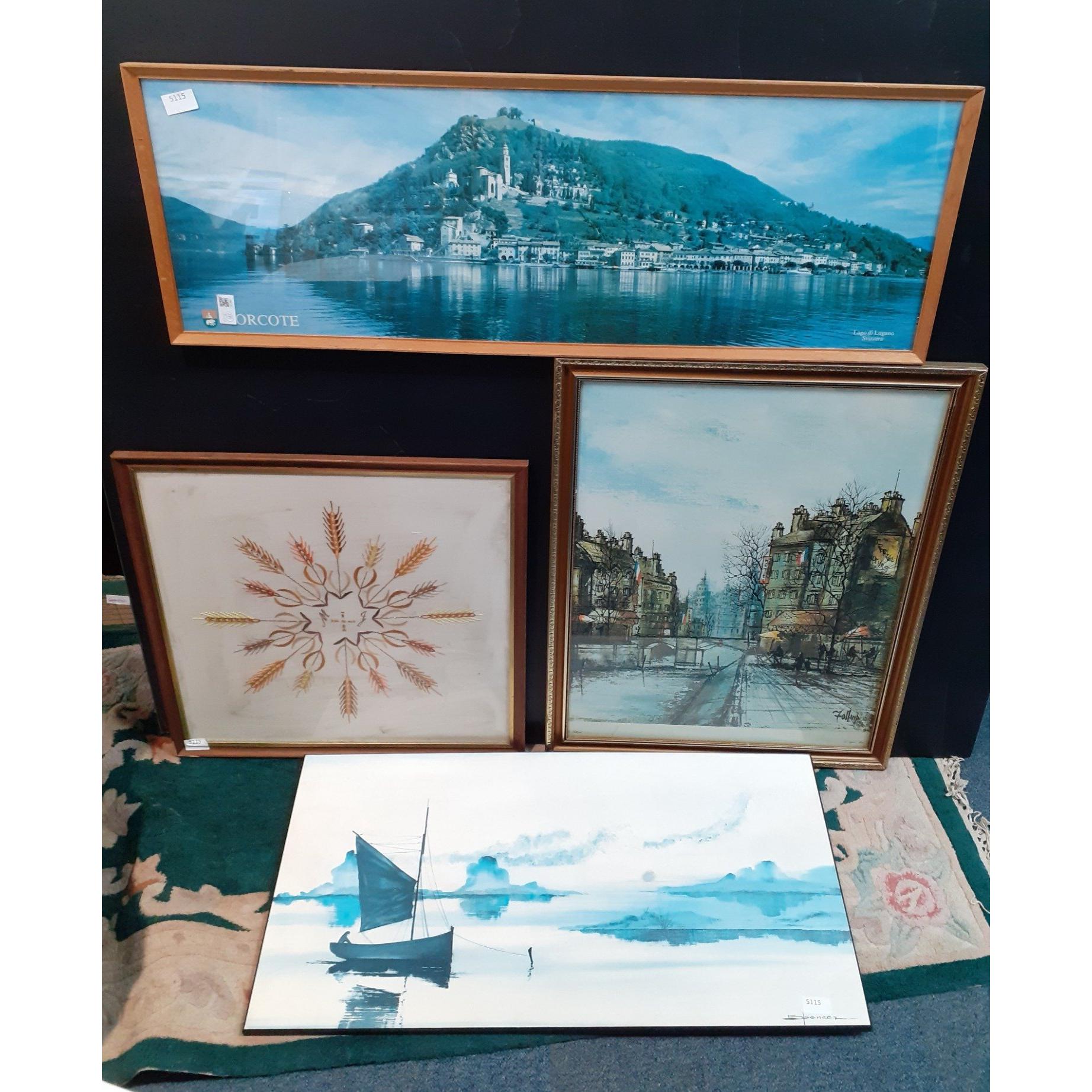 Four nice decorative pieces to include an embroidered panel (57 x 54cm approx), an Oriental style print by Spencer, a scene Morcote on Lake Lagano 98cm long approx and a Paris sceneApprox 4 pieces