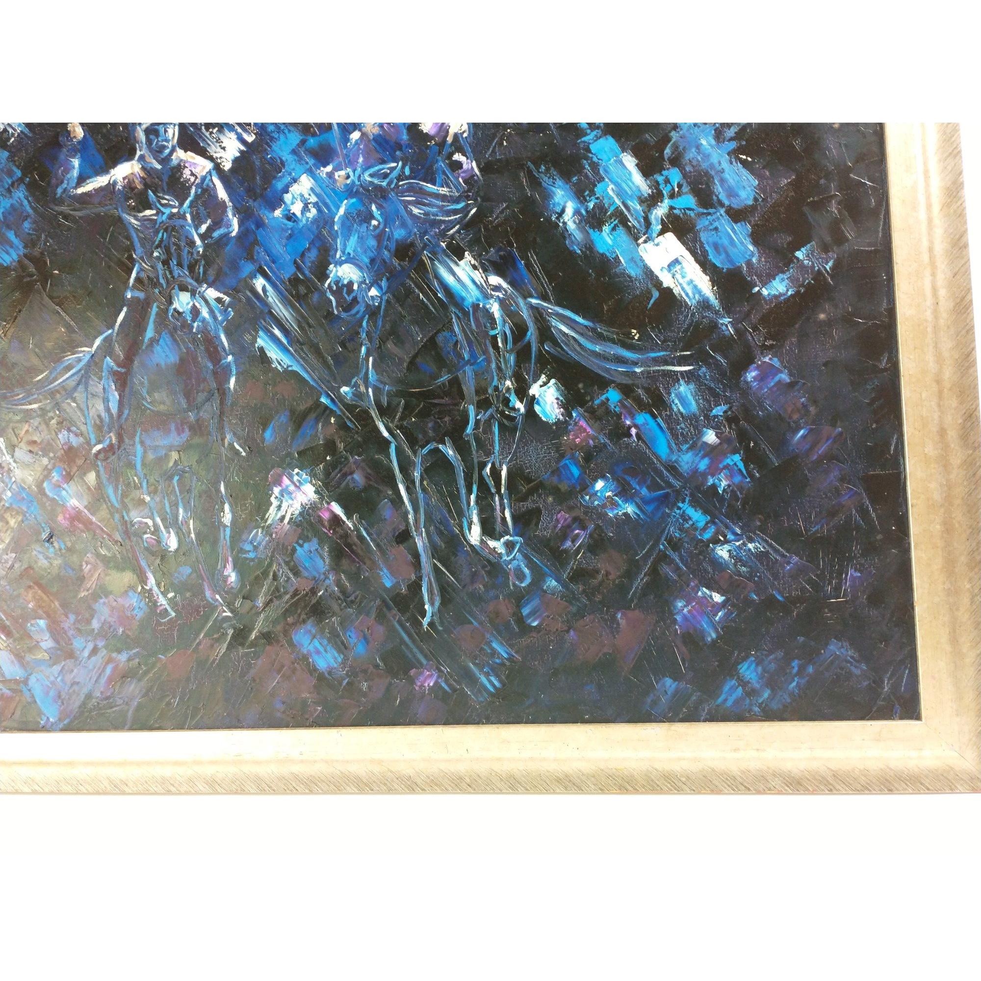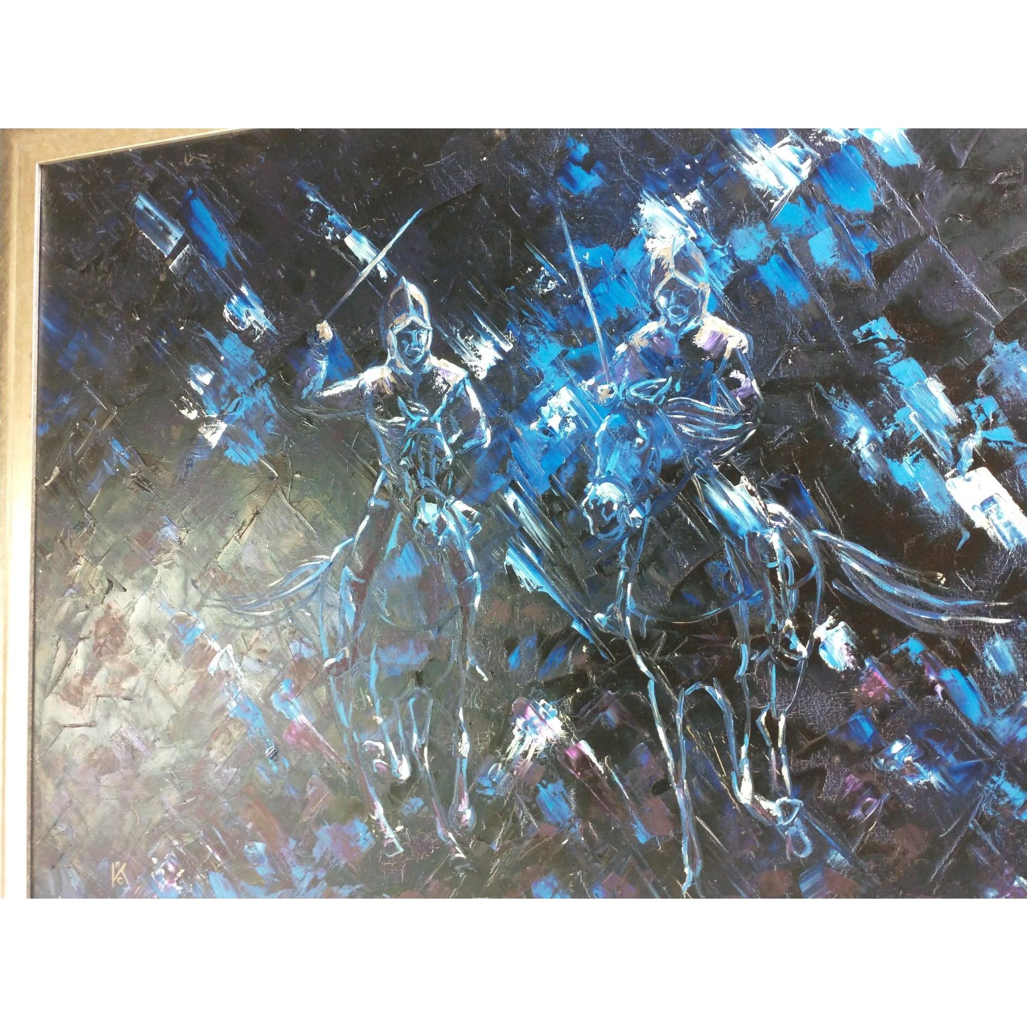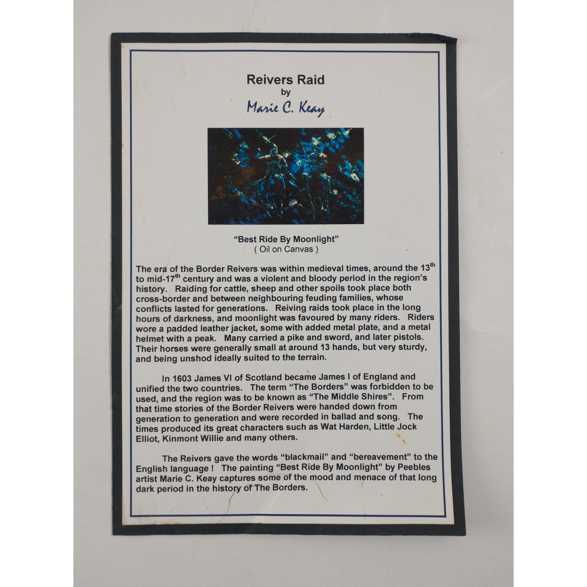 SCOTTISH BORDERS AND PEEBLES INTEREST - An original oil on canvas 'Best Ride By Moonlight' by MARIE C KEAY - 36" x 24" - depicts Border Reivers on horseback raiding by moonlight - this painting comes with a separate interesting story-board