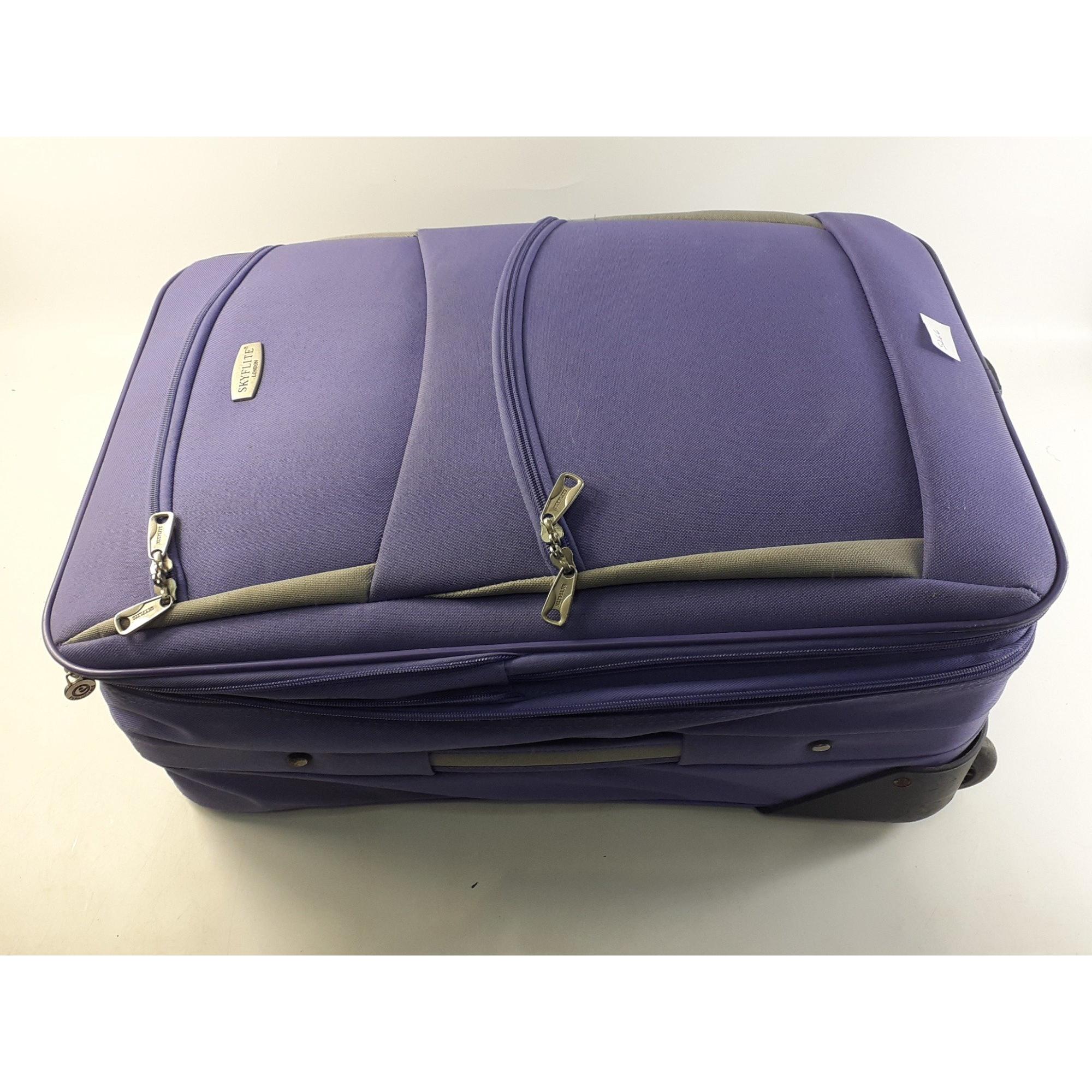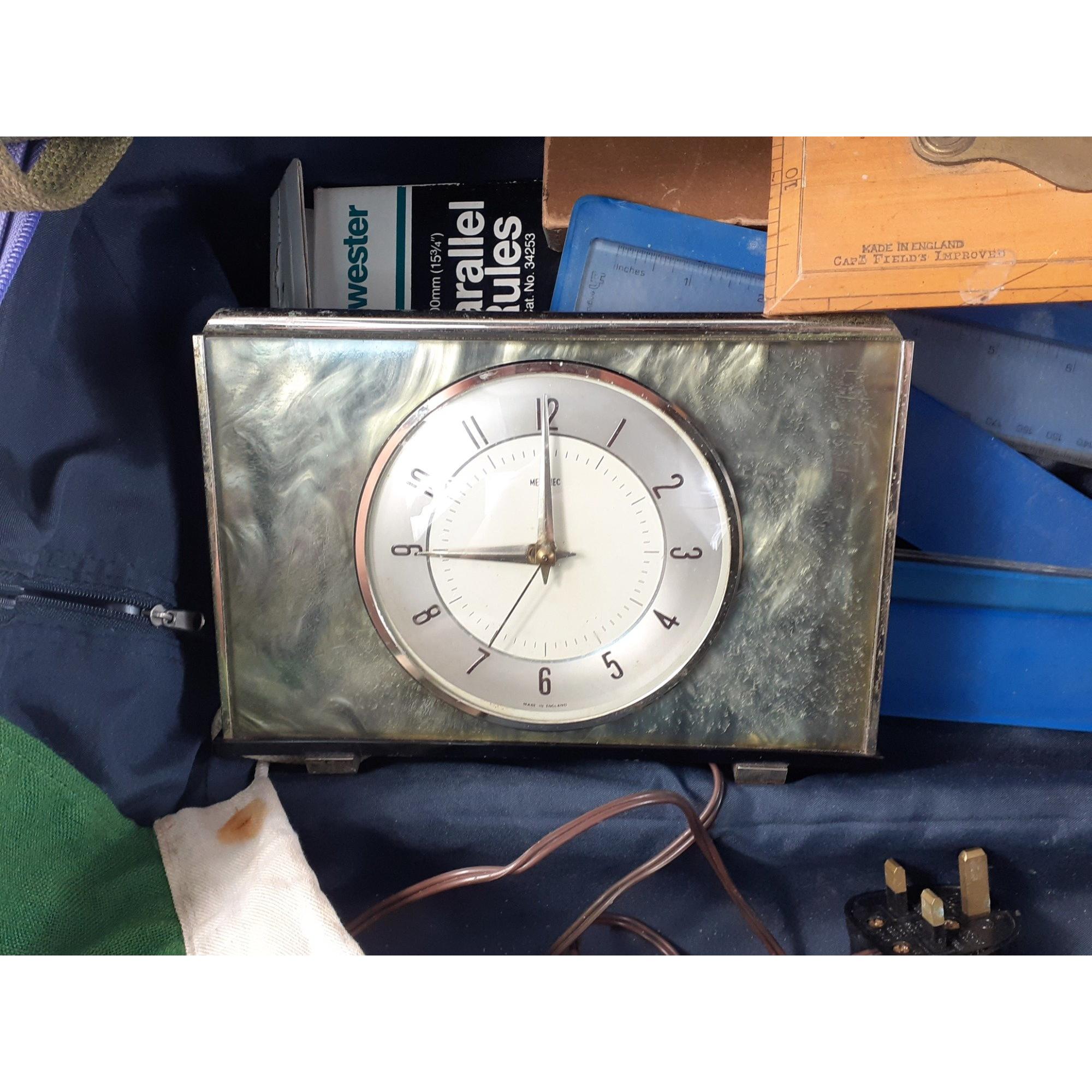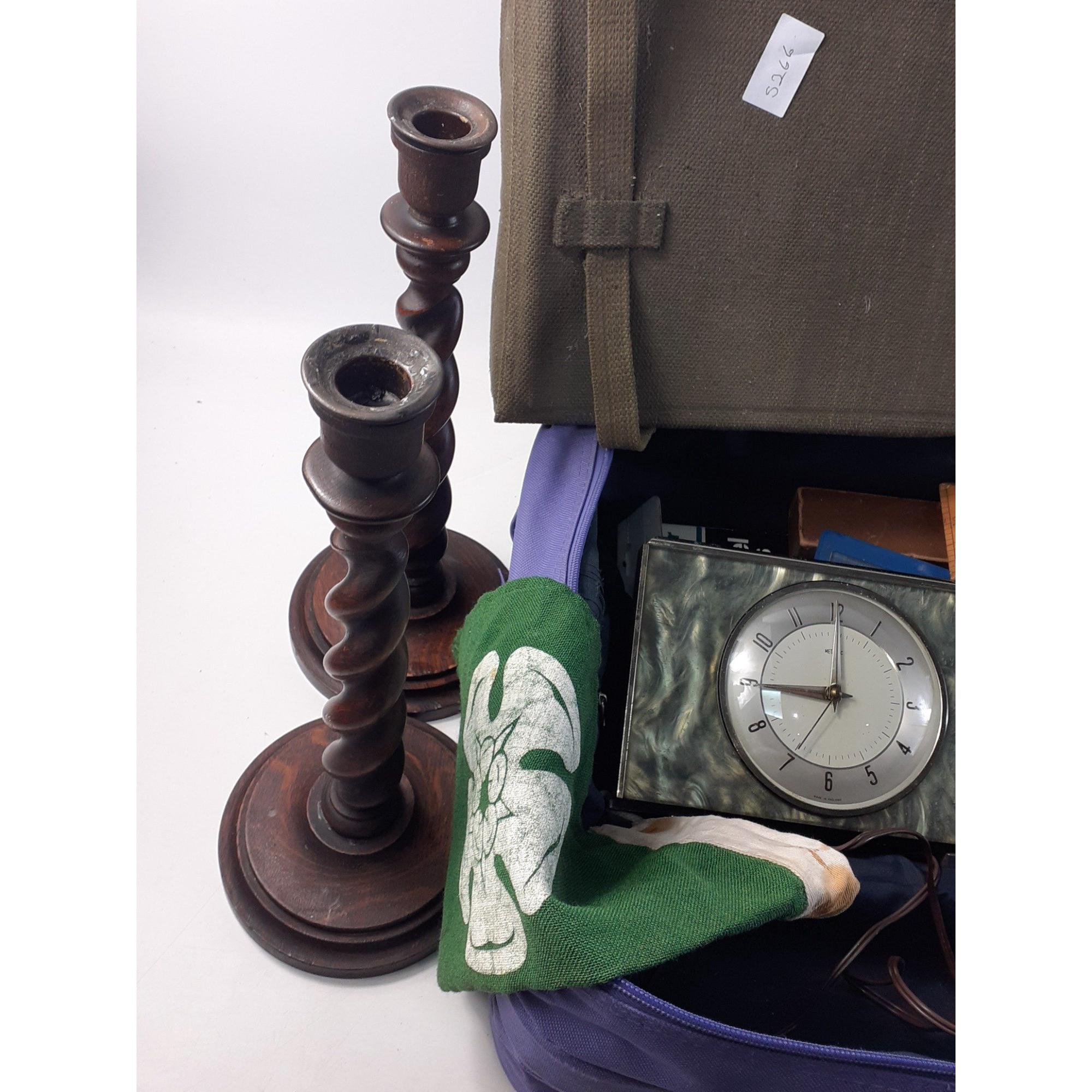 A useful SKYFLITE wheelie travel case containing 2 turned wooden candlesticks, good collection of draughtsman rules, and electric clock, 2 x 1980s fur-lined winter hats, military satchels, and a military style pennant