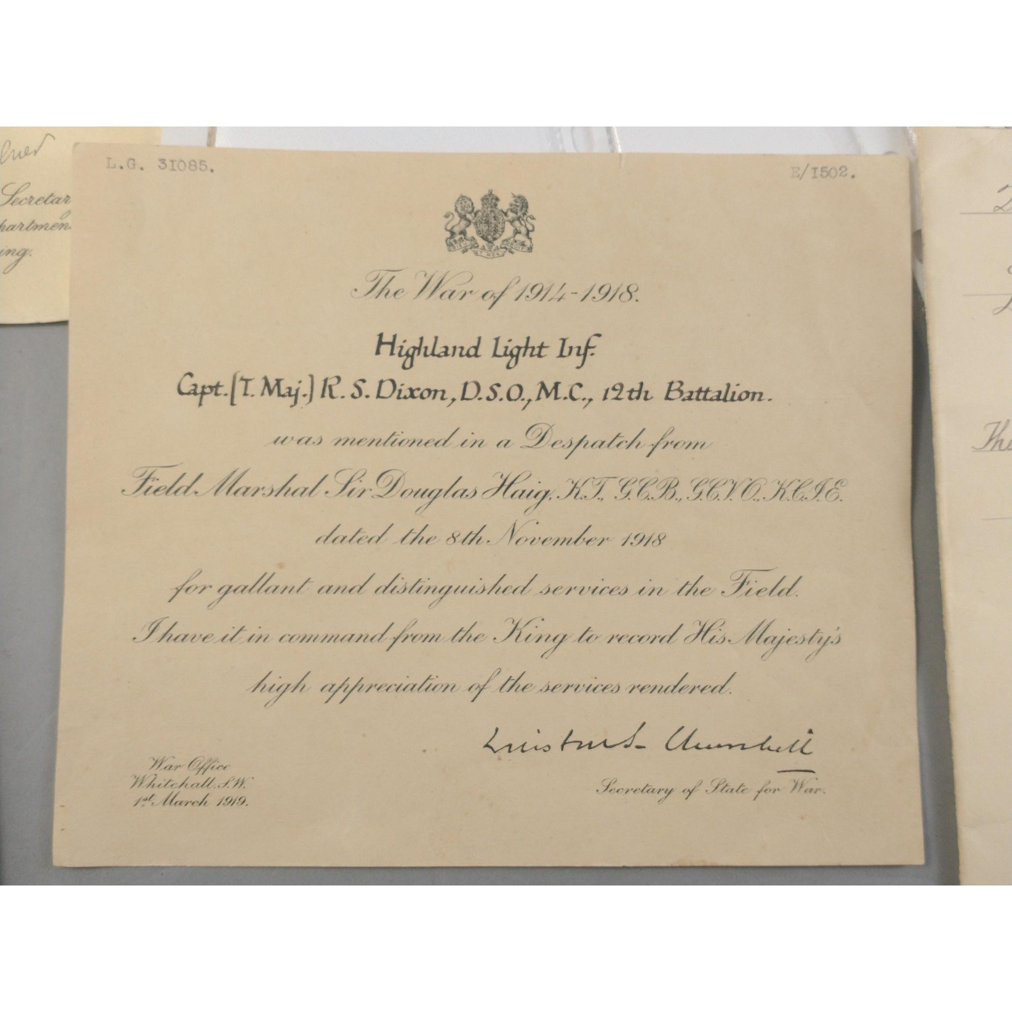 - Numerous copies 1914-1919 Supplement to the LONDON GAZETTES which mention Speirs Dixon including his Gallantry DSO Citation (above) from 26 July 1918