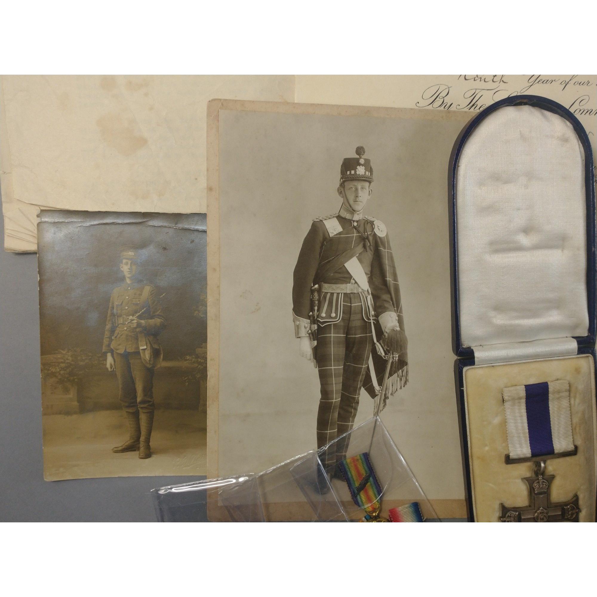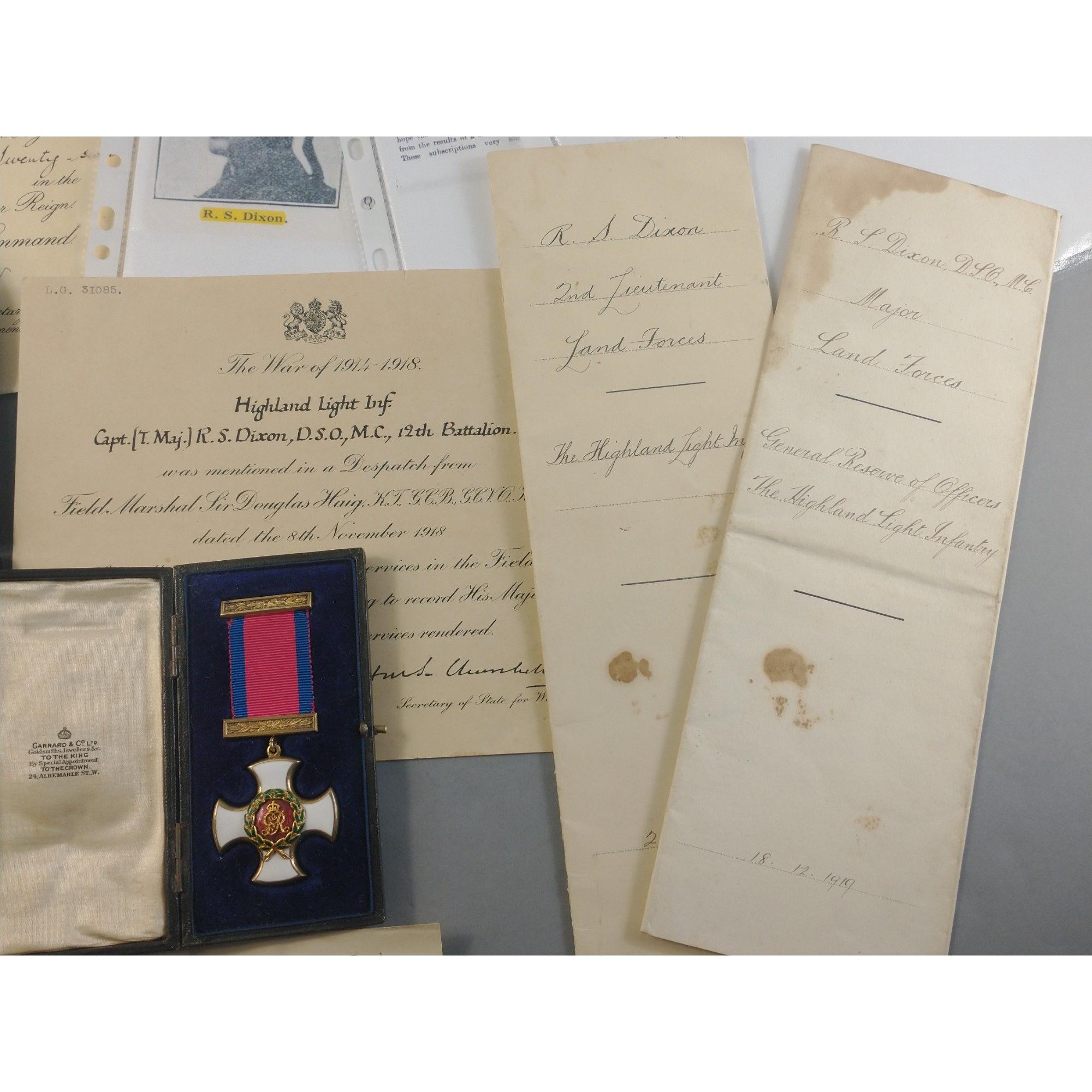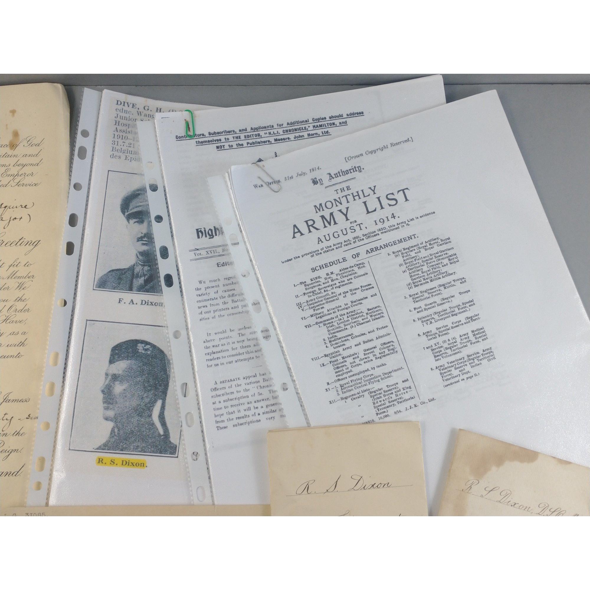 Stunning and rarely available DOUBLE Gallantry twice wounded WWI medal group to Major Robert Speirs Dixon with a huge number of original photos and documents charting the rise of a very young 2nd Lieutenant from 1914 - all the way to a ridiculously young "acting" Lieutenant-Colonel of the Highland Light infantry by the end of the war (such were the levels of officer casualties).