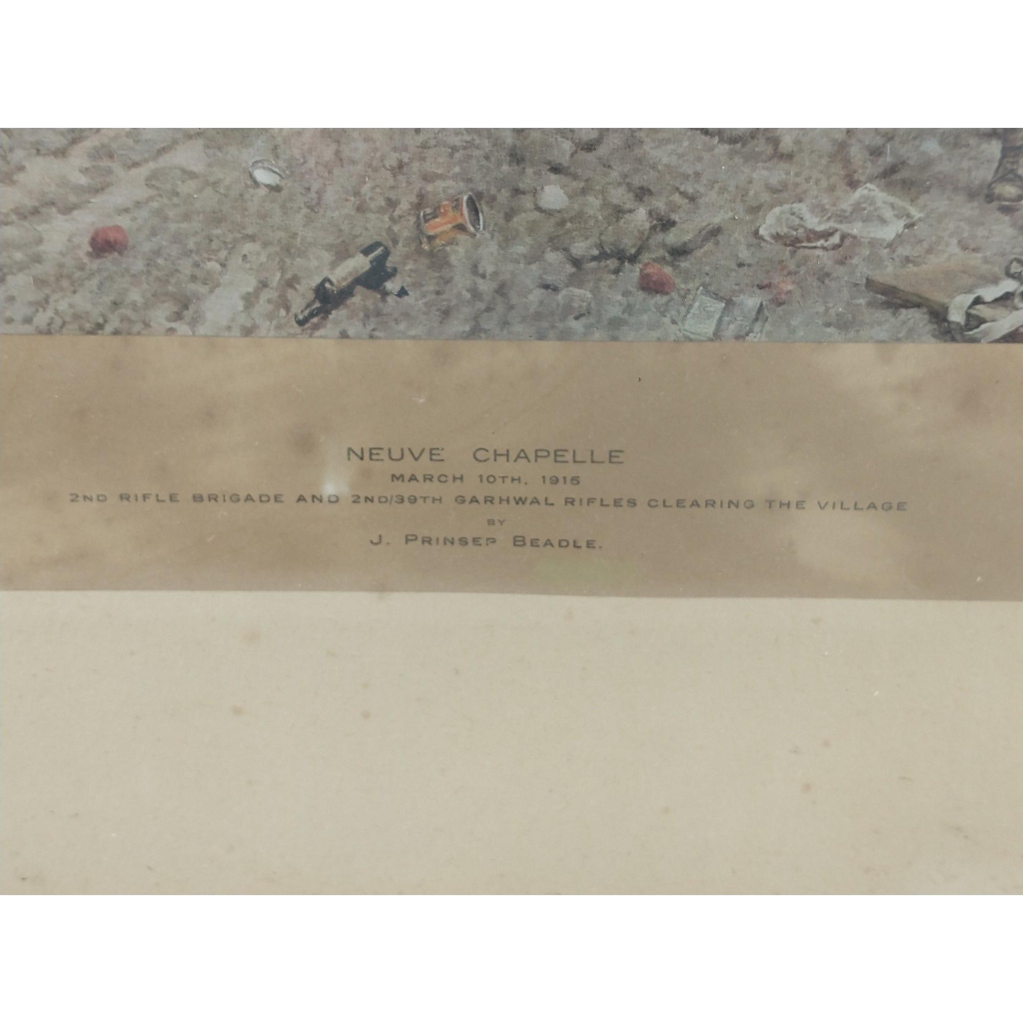 An antique picture 1916 Royal Academy print by GEORGE PULMAN of London showing a wonderful colour image of the 2nd Rifle Brigade and the 2nd /39th Garhwal Rifles clearing the village at NEUVE CHAPPELLE by J. PRINSEP BEADLE. Frame 73 x 62cm approx