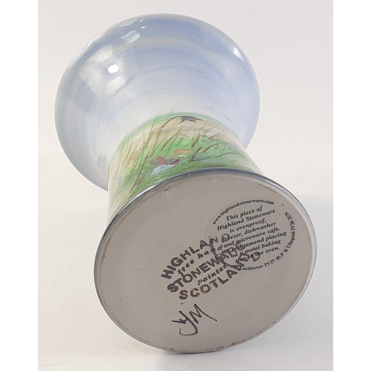 HIGHLAND STONEWARE vase hand painted and signed to the base YM, with a seaside scene. Stands 17cm tall and in excellent condition.