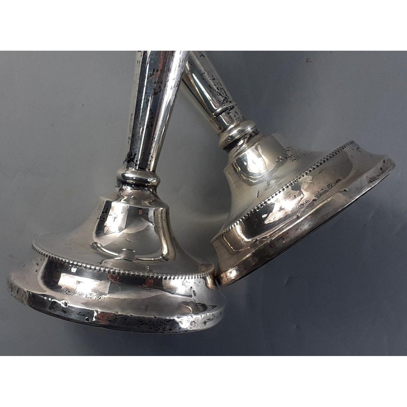 A pair of silver hallmarked candlesticks. Hallmarks for Birmingham 1924. Each 26cm tall. Gross weight 800g approx. Sealed base, likely weighted