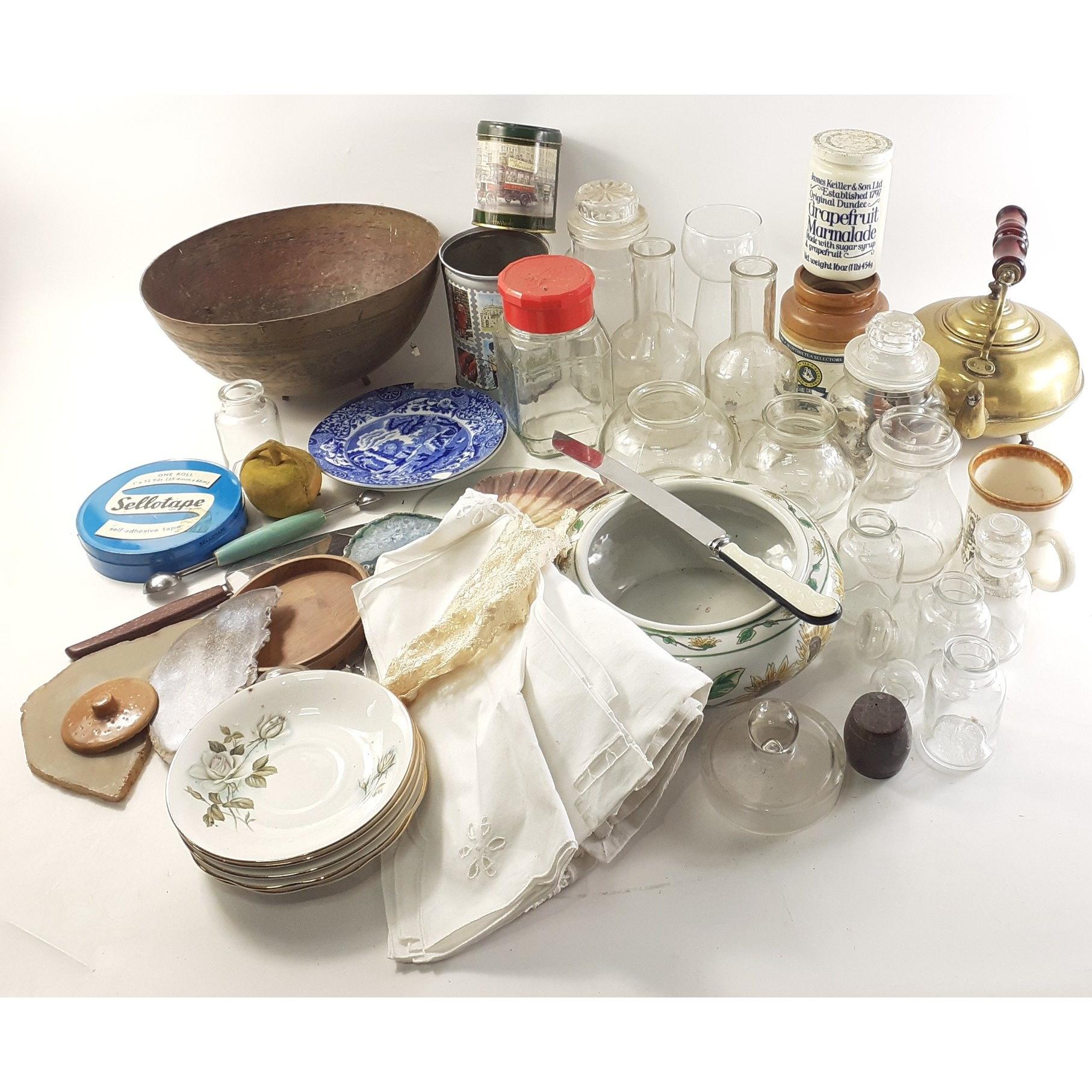 A mixed lot comprising brass bowl, brass teapot, glass storage jars, some sliced quartz, assorted kitchenware and others.