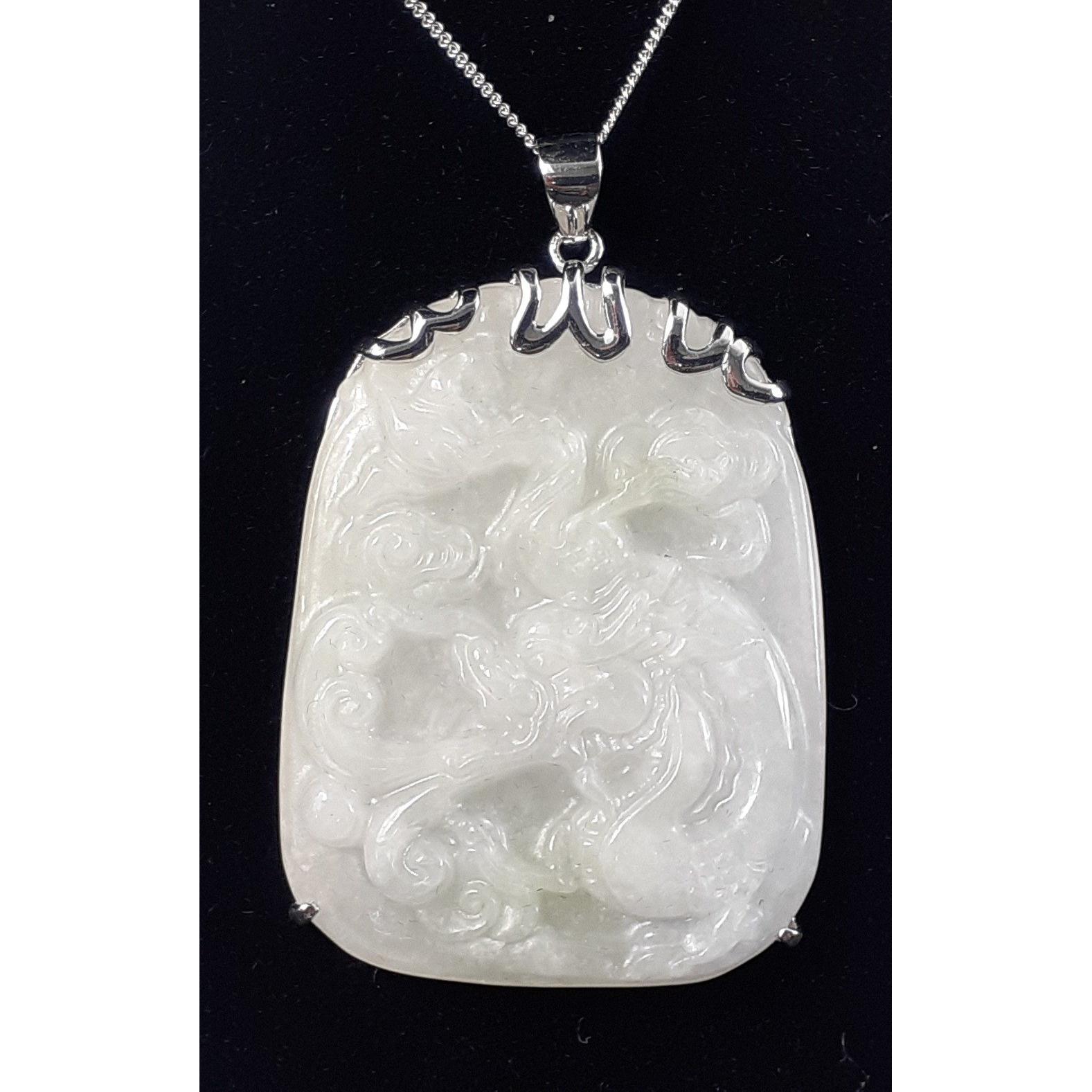 TJC RARE carved natural white jadeite jade pendant on chain. In platinum overlay sterling silver.