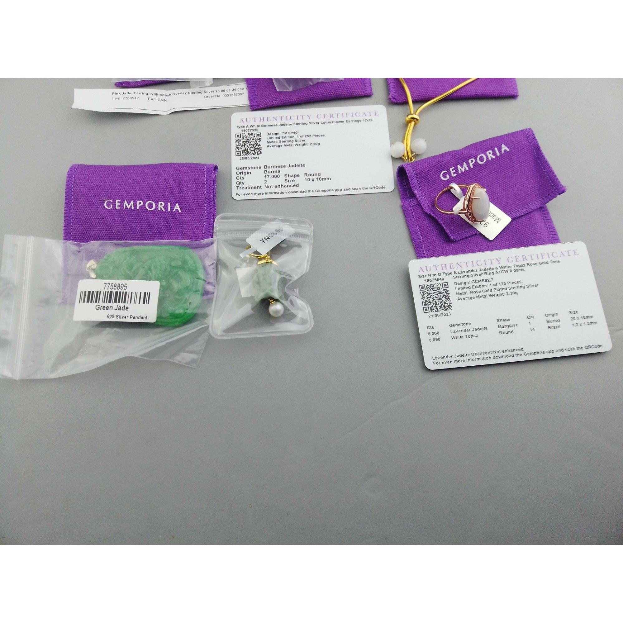 GEMPORIA - mixed lot to include green jade pendant, 925 bracelet, jadeite lotus flower earrings, silver rings (N/O), drop pendant and a pair of pink jade silver earrings