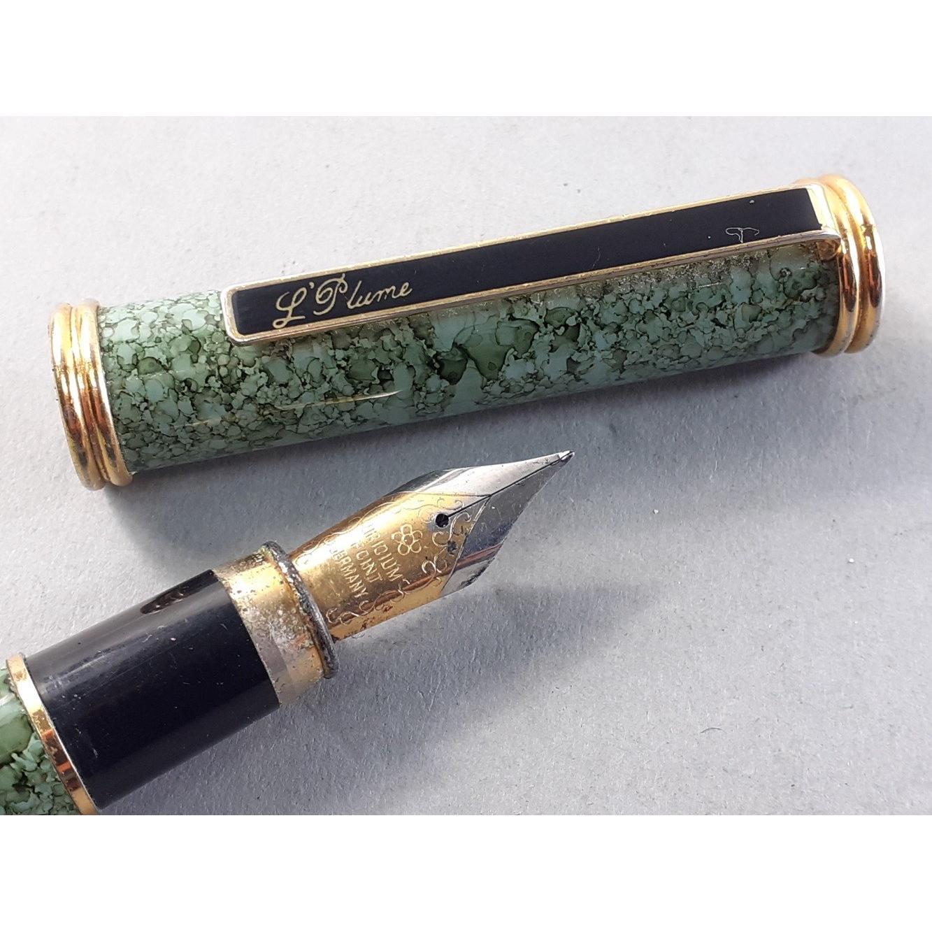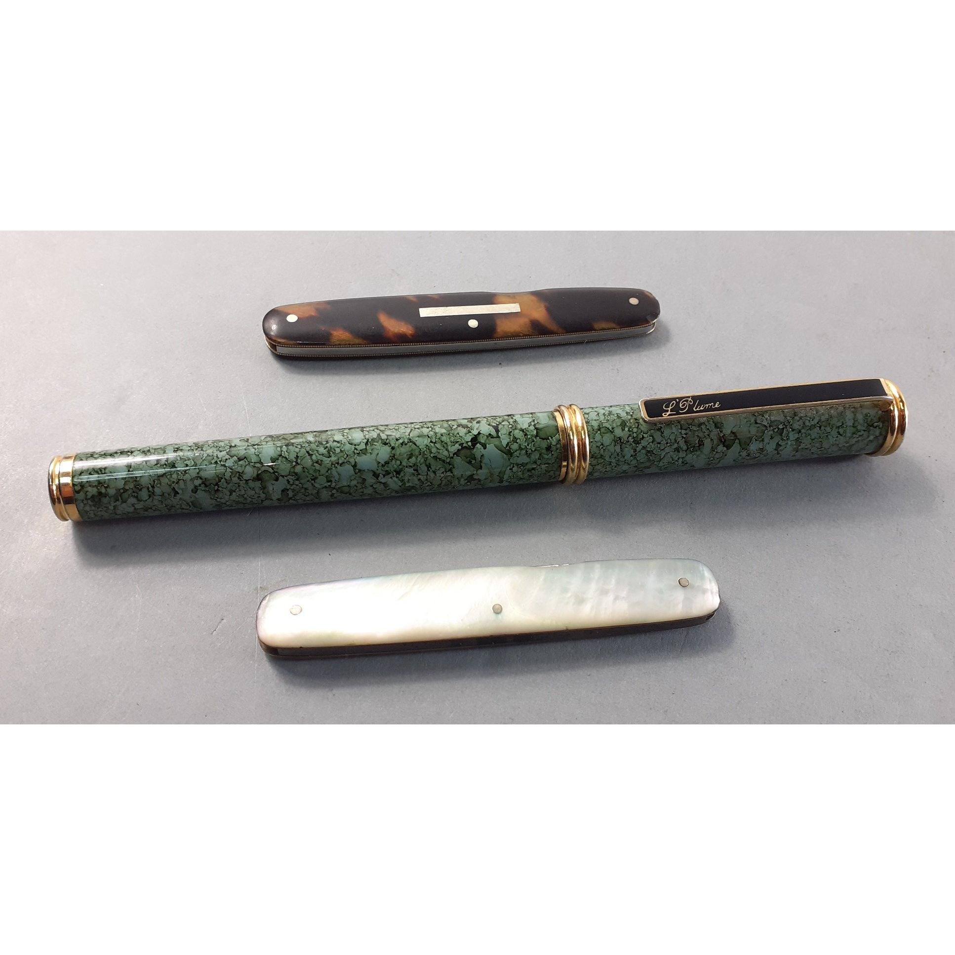 L'PLUME Fountain Pen in attractive green mottled finish. Iridium Point nib. With a pretty tortoiseshell handled penknife and a Mother of Pearl handled penknife.