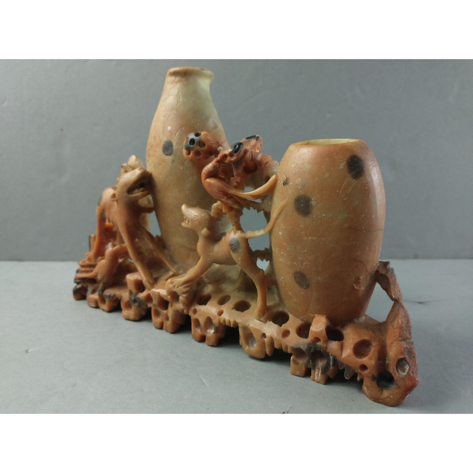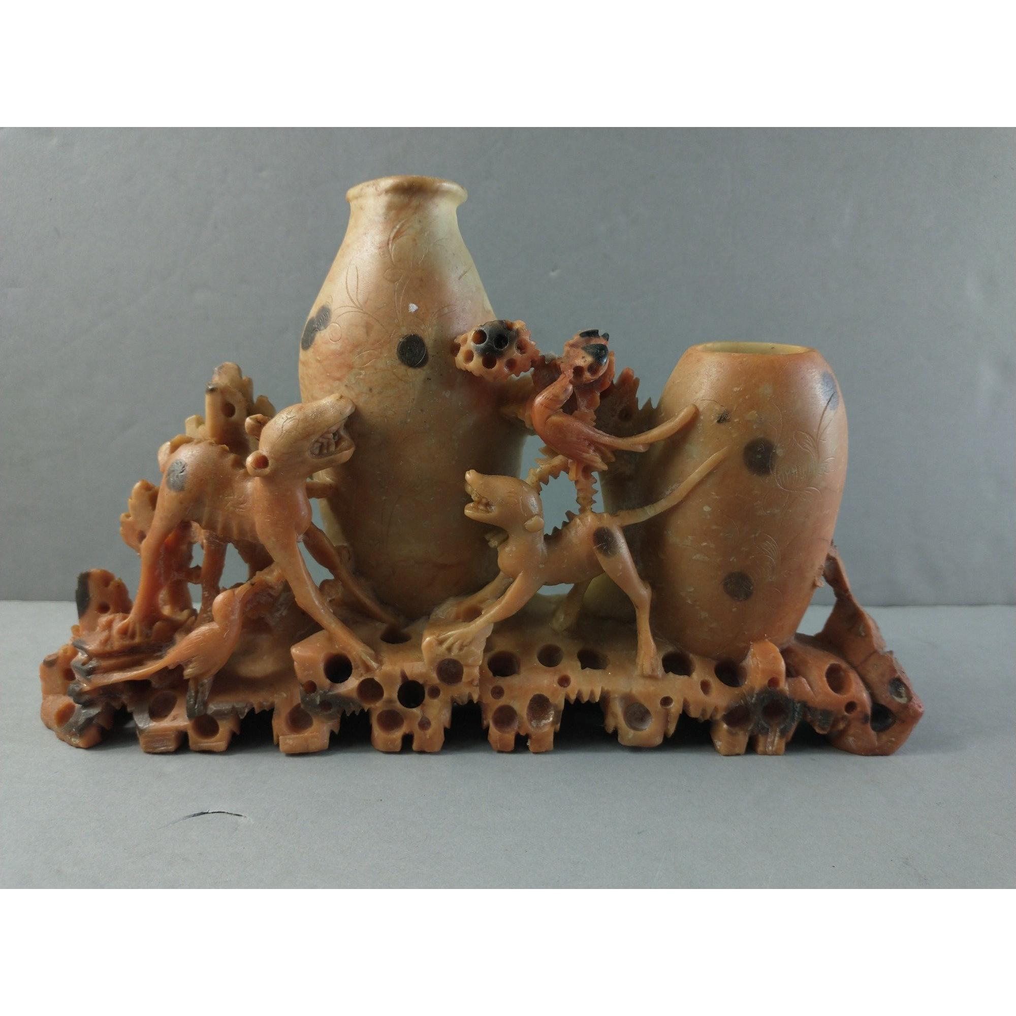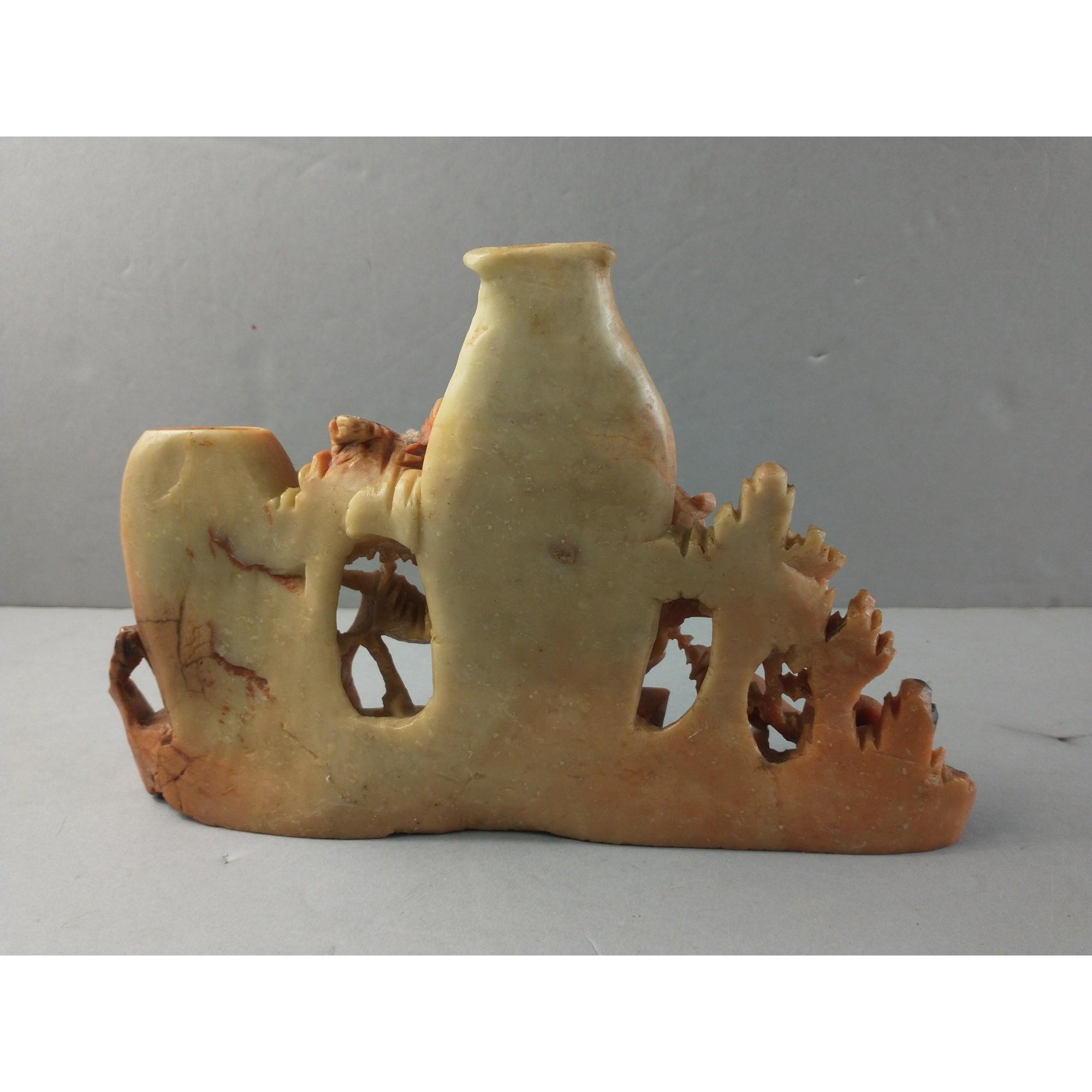 Oriental figural soapstone brush pot group. Measures 25cm across approx.