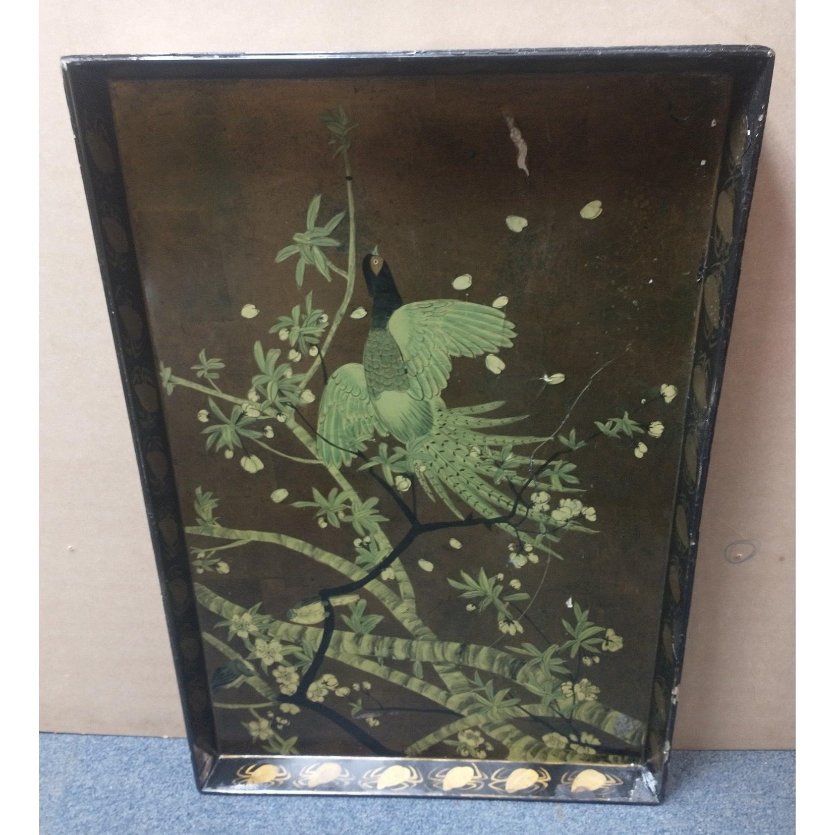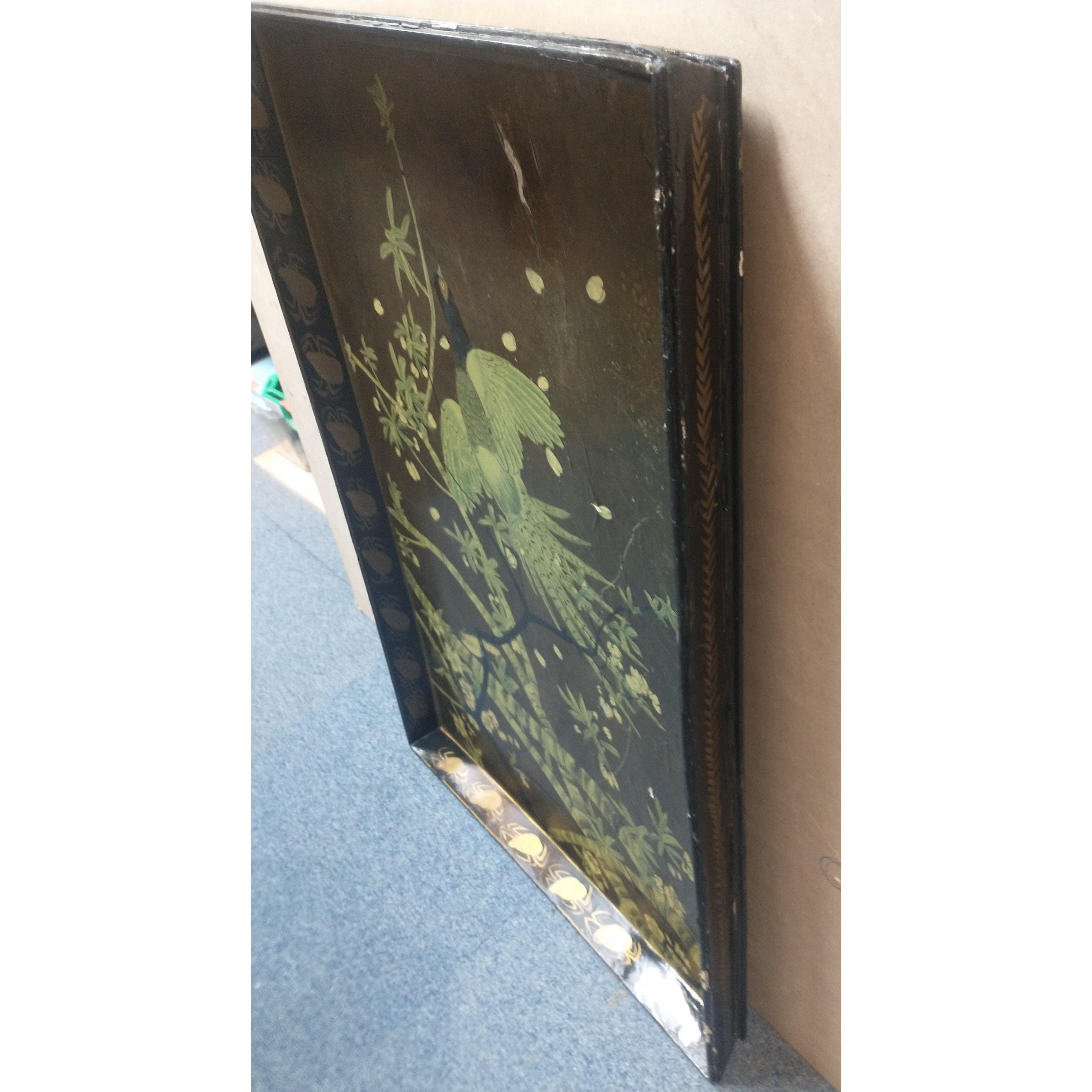 A HUGE and impressive Oriental papier mache tray with gilt decoration and figural pheasant centre. A substantial 93cm tall approx. Minor wear and overall good condition.