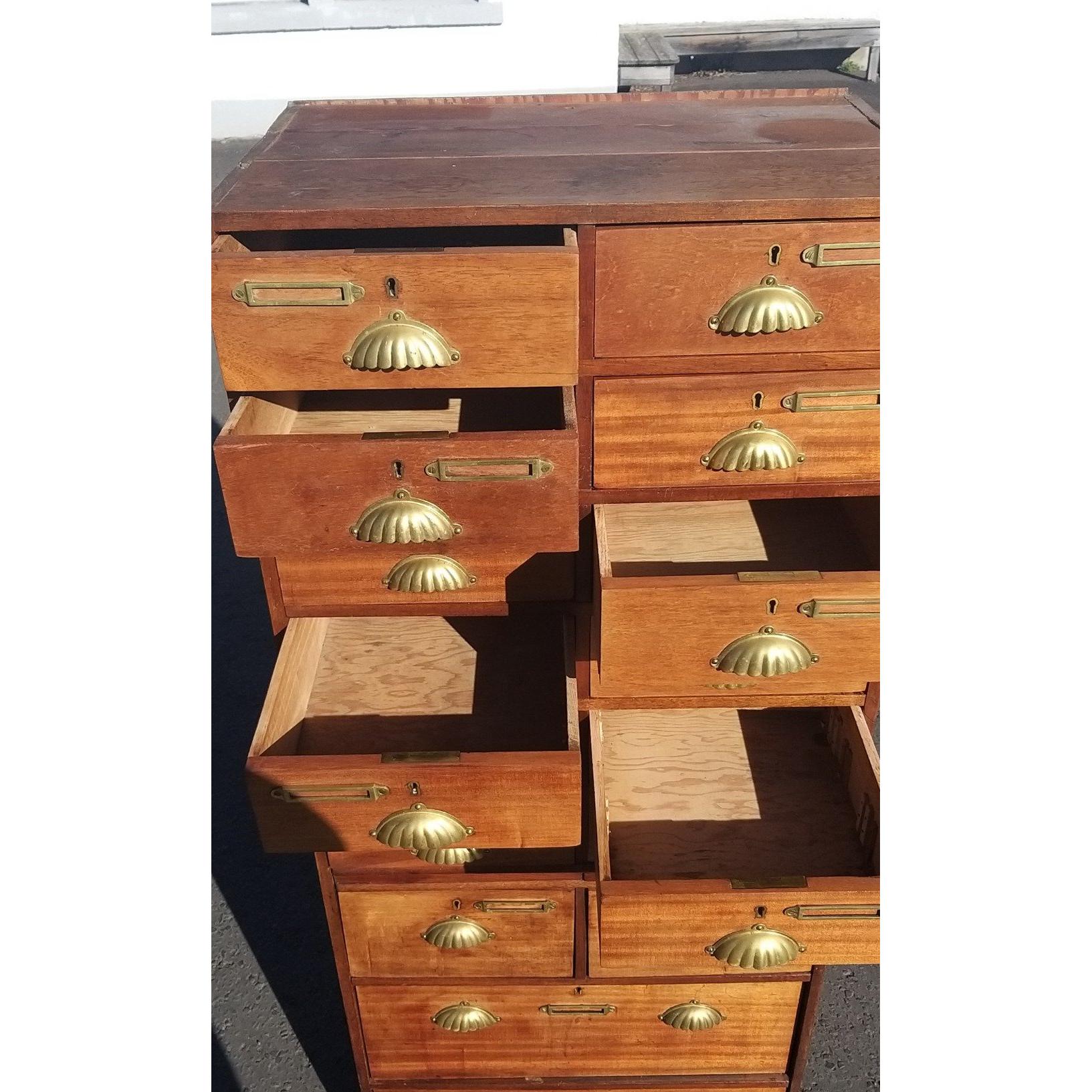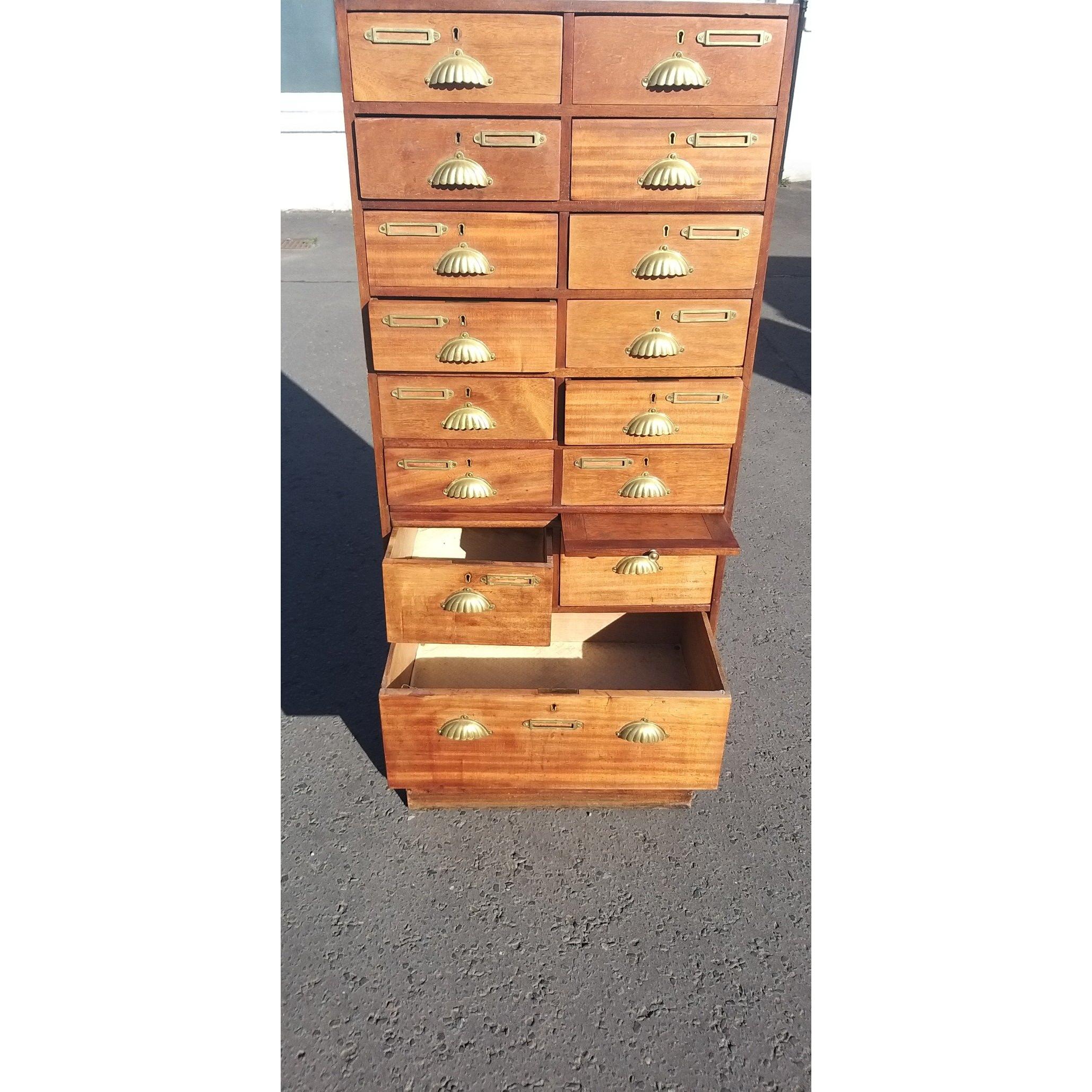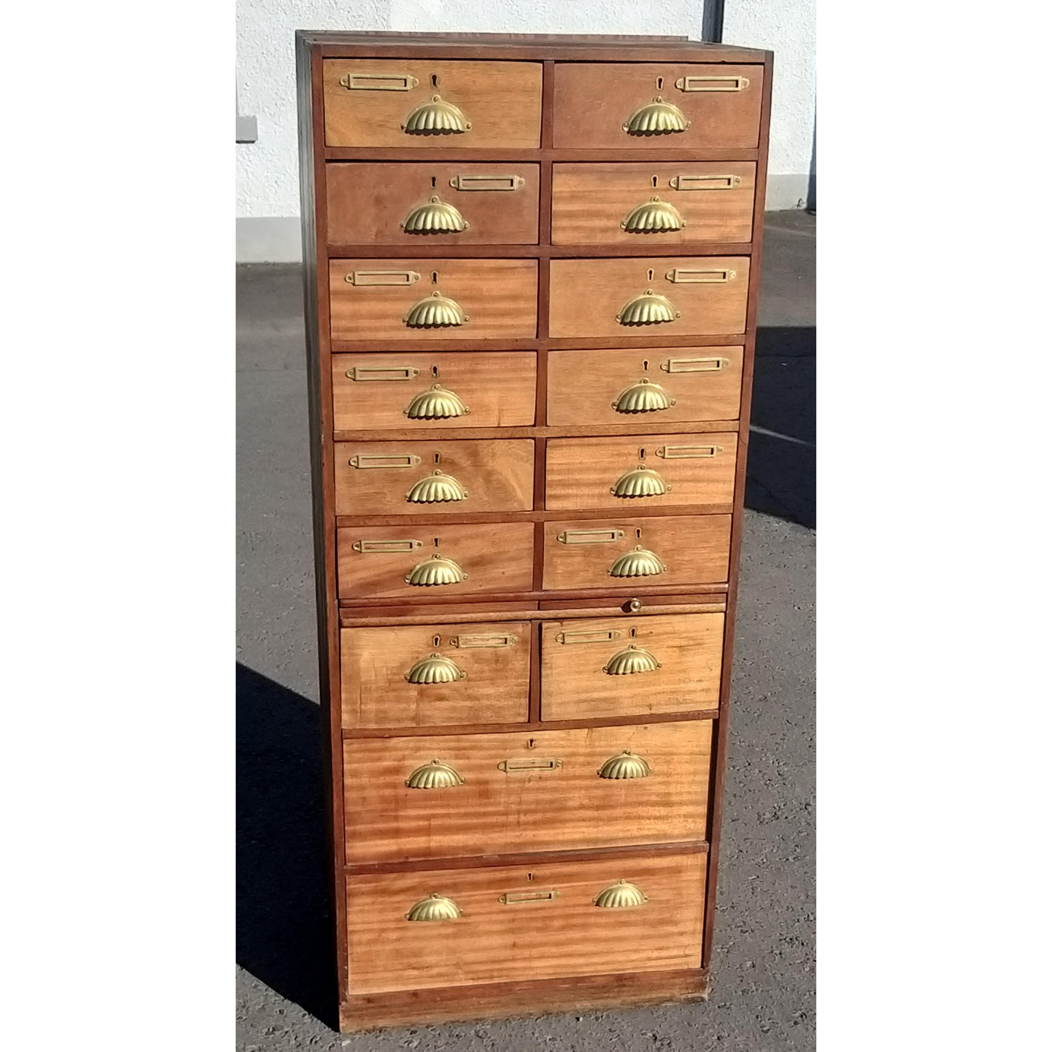 A c1930's SPECIMEN CABINET with multiple drawers with a pull out slide shelf original shell form brass handles