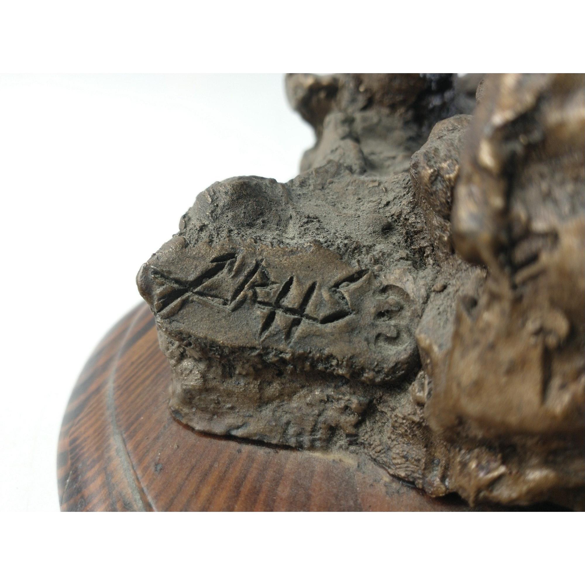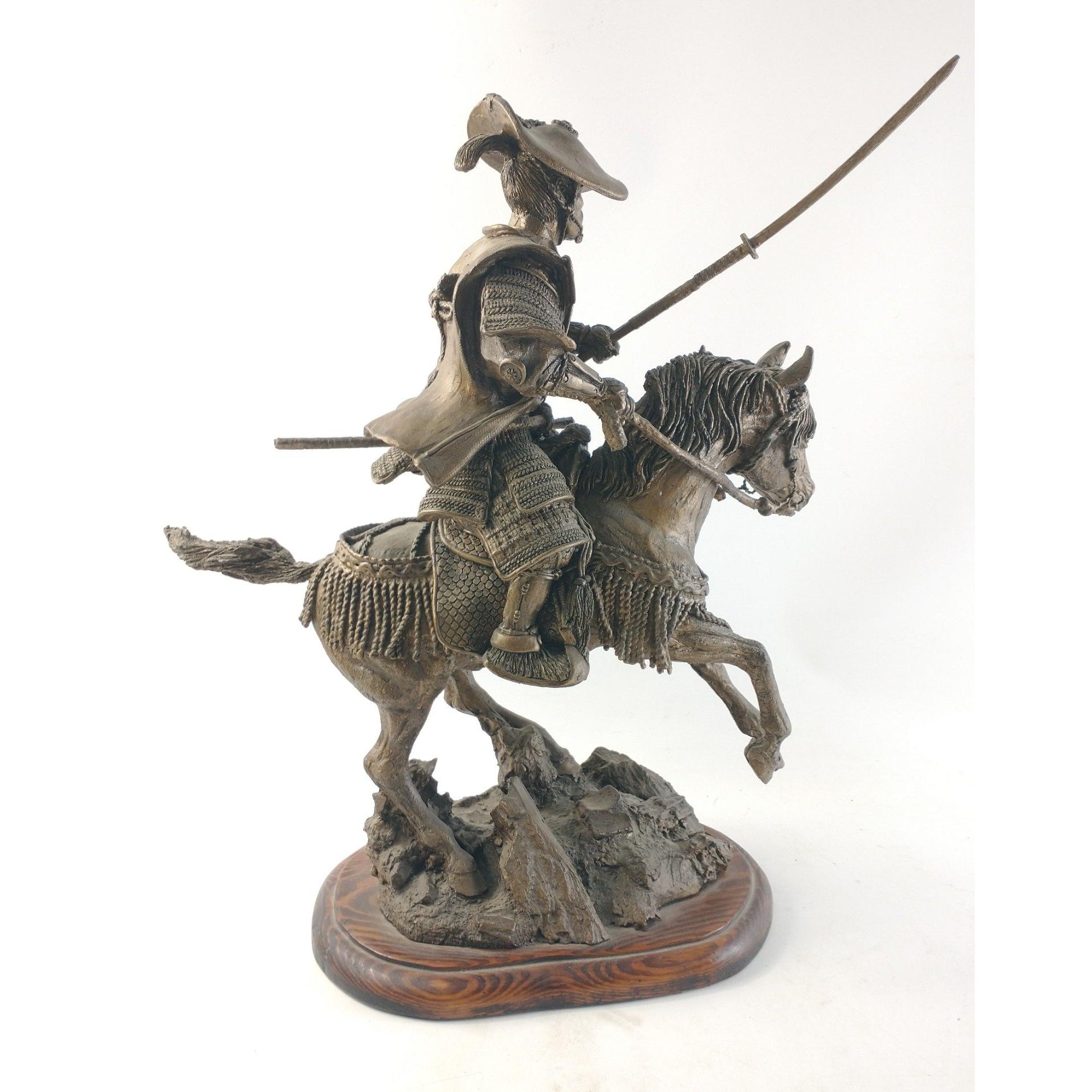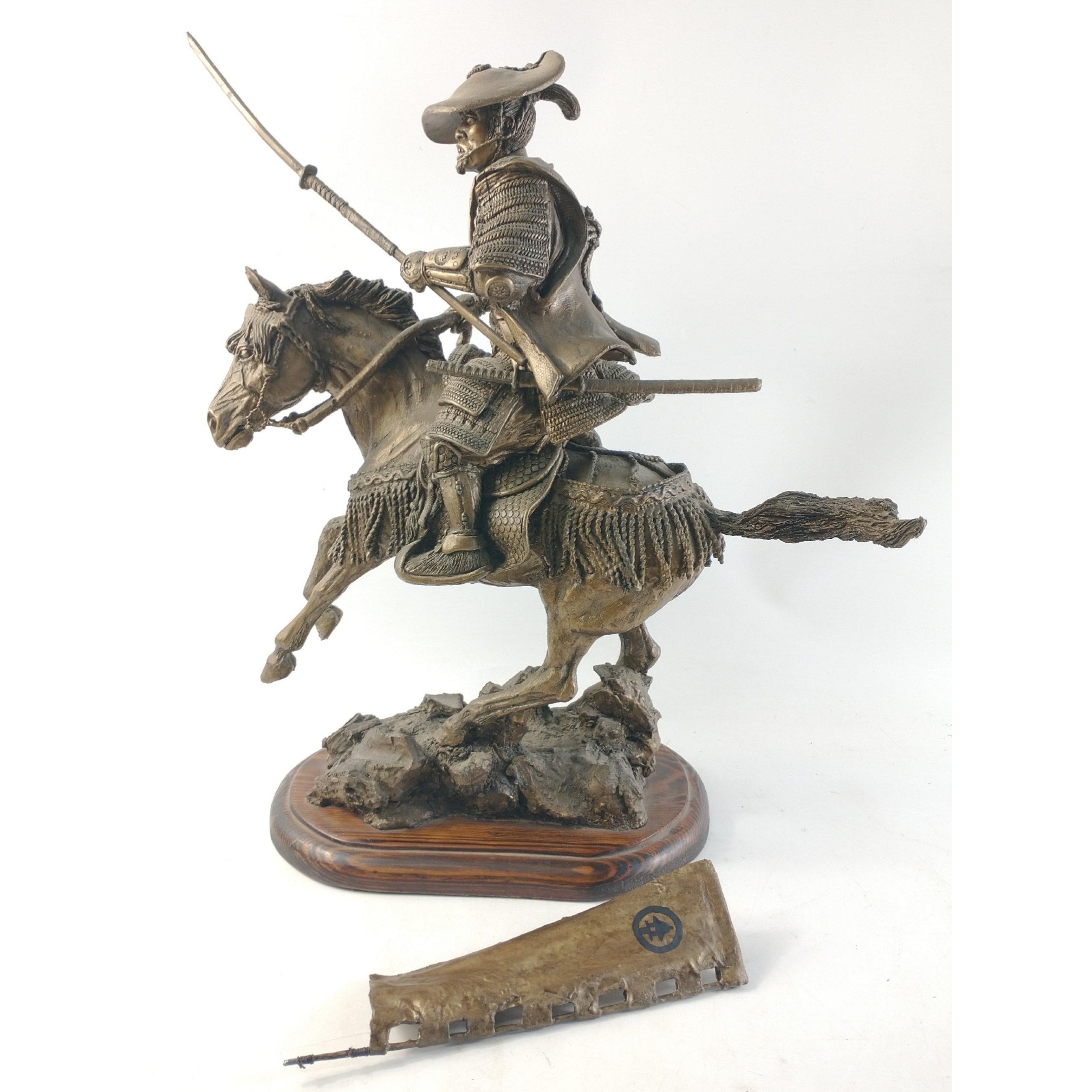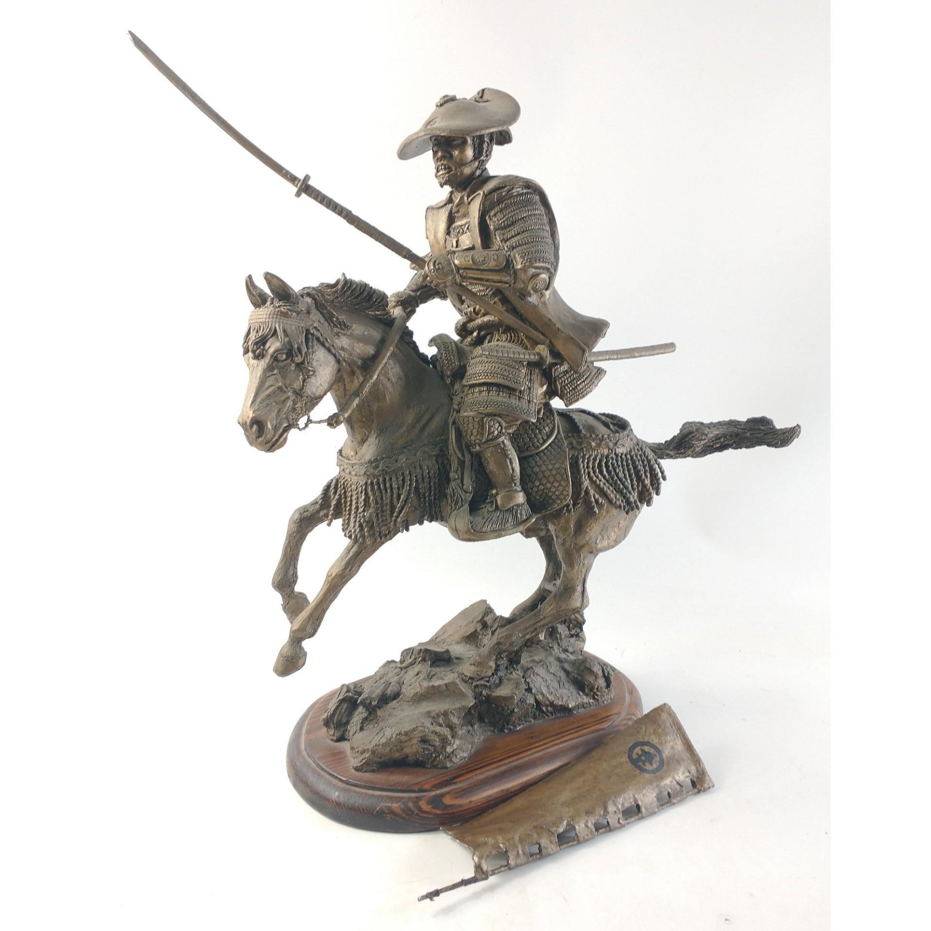 UMM An impressive Samurai figure mounted on a rearing horse mounted on a wooden plinth. Stands approx 50cm tall. Pennant to be re-attached. Approx 1 pieces