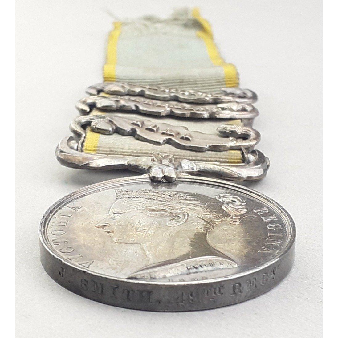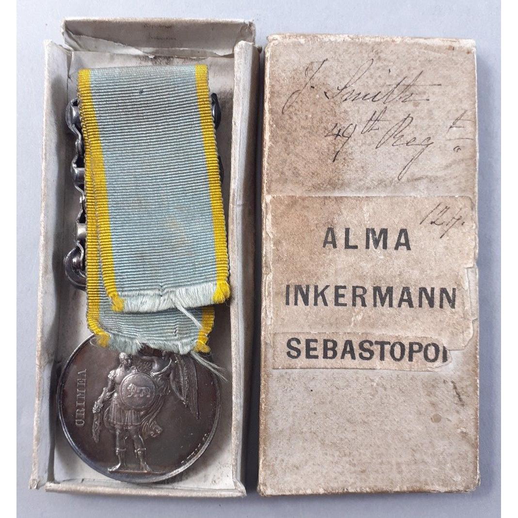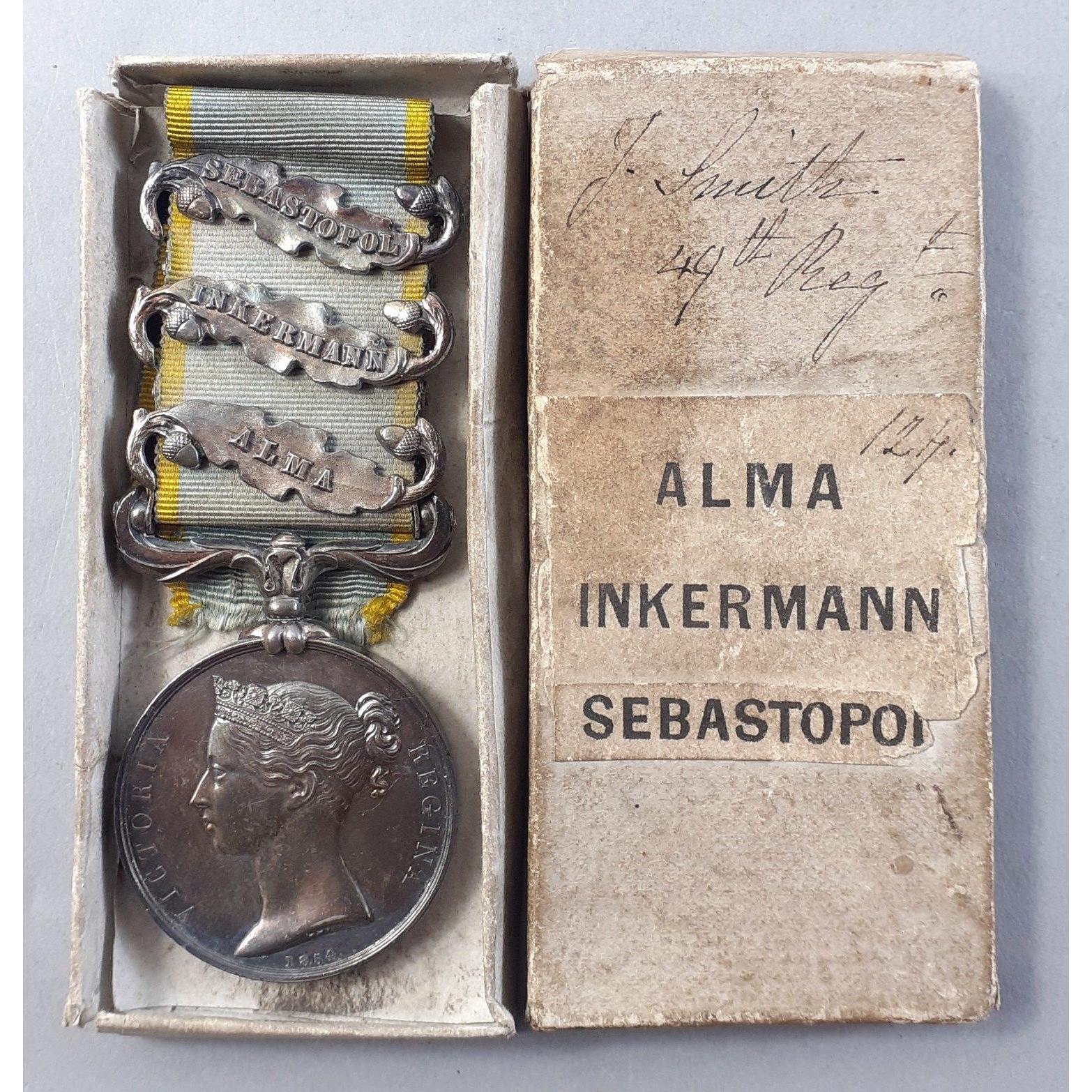 Crimea Medal 1854-56 Three clasps - Alma, Inkermann, Sebastopol, named to Private J Smith 49th Regiment of Foot, Princess Charlotte of Wales's, (Hertfordshire). Unusually still in original box of issue.