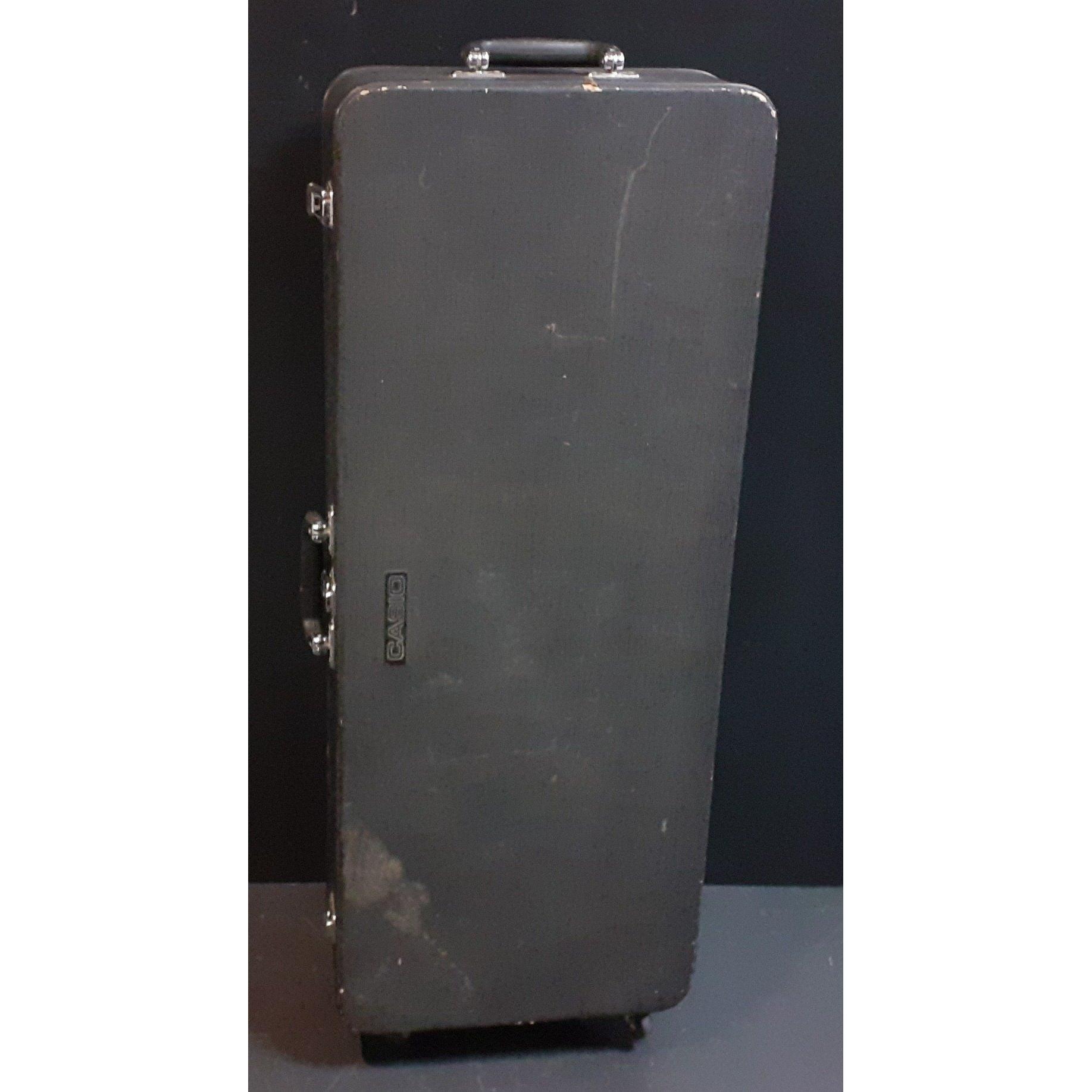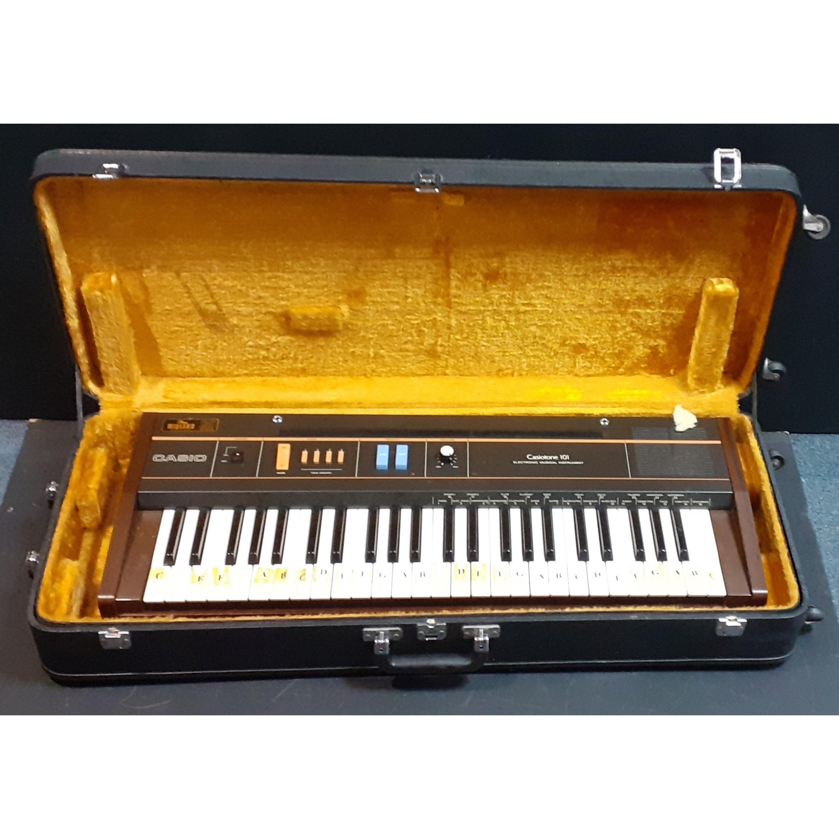 A CASIO-TONE 101 electronic musical keyboard in a wheelie-.case