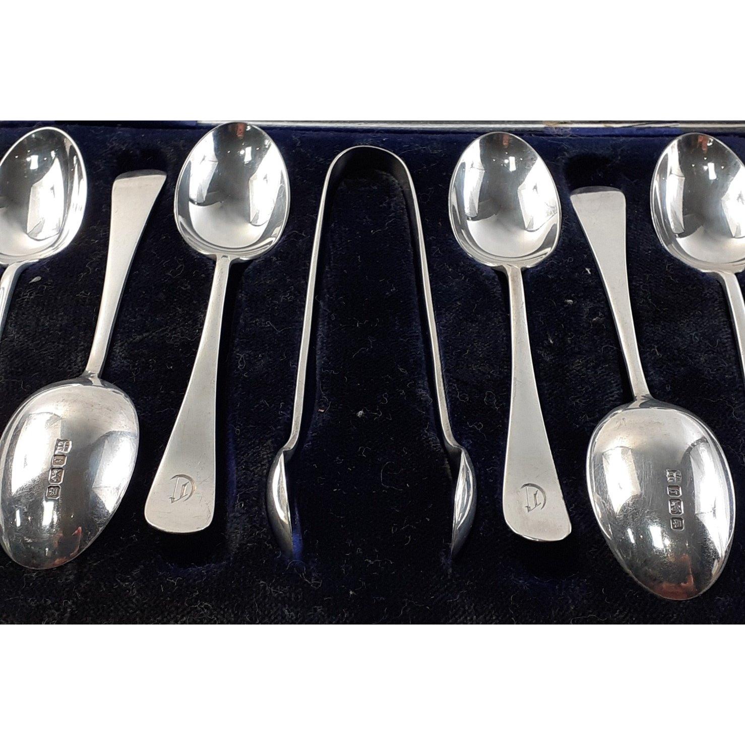 A cased SILVER HALLMARKED teaspoon set with sugar nips. Lovely set Sheffield 1908. Gross weight 90g approx.