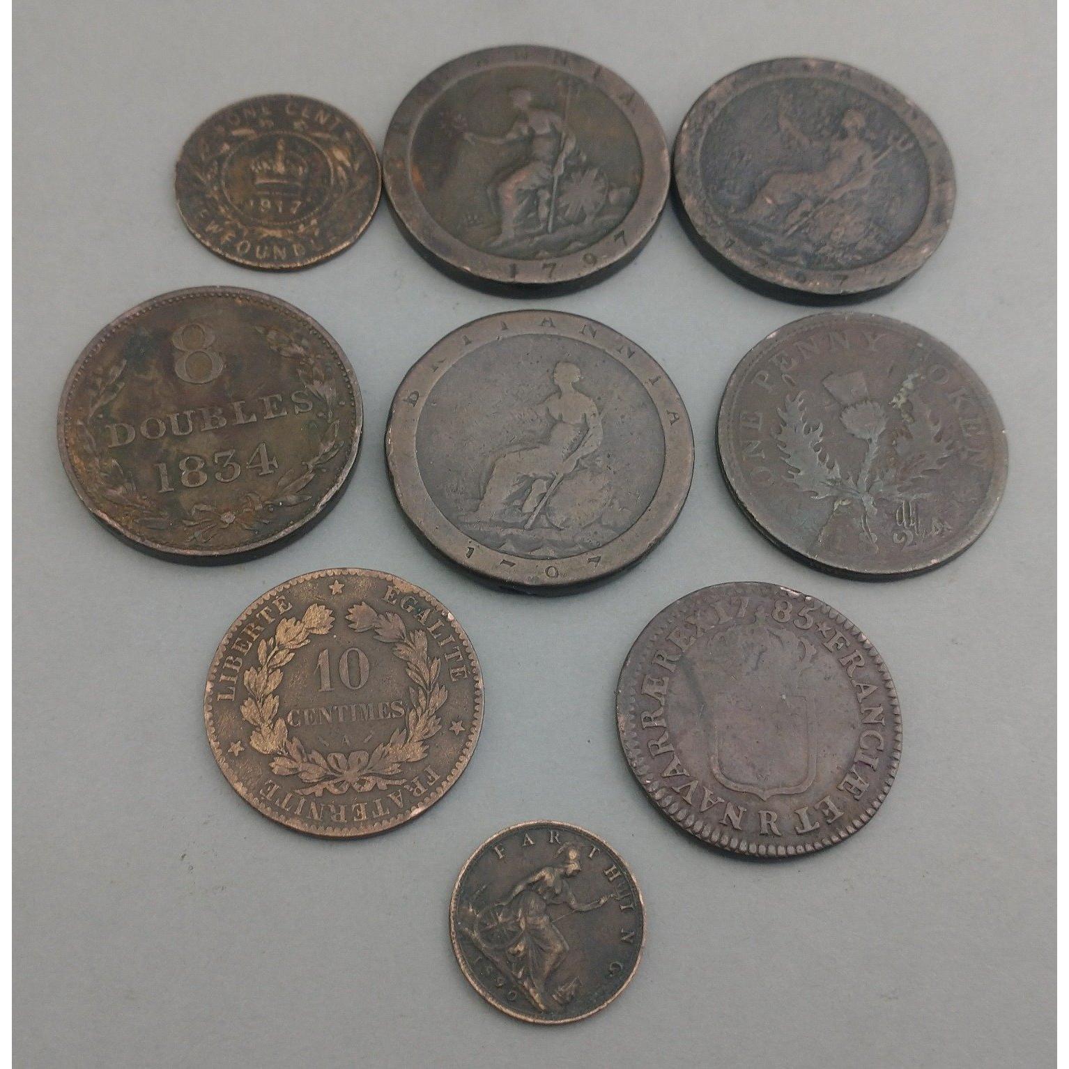 Copper COINS of interest to include three 1797 Cartwheel pennies, one better grade, French Louis XVI with strong portrait, nice 1824 Nova Scotia thistle back penny and others