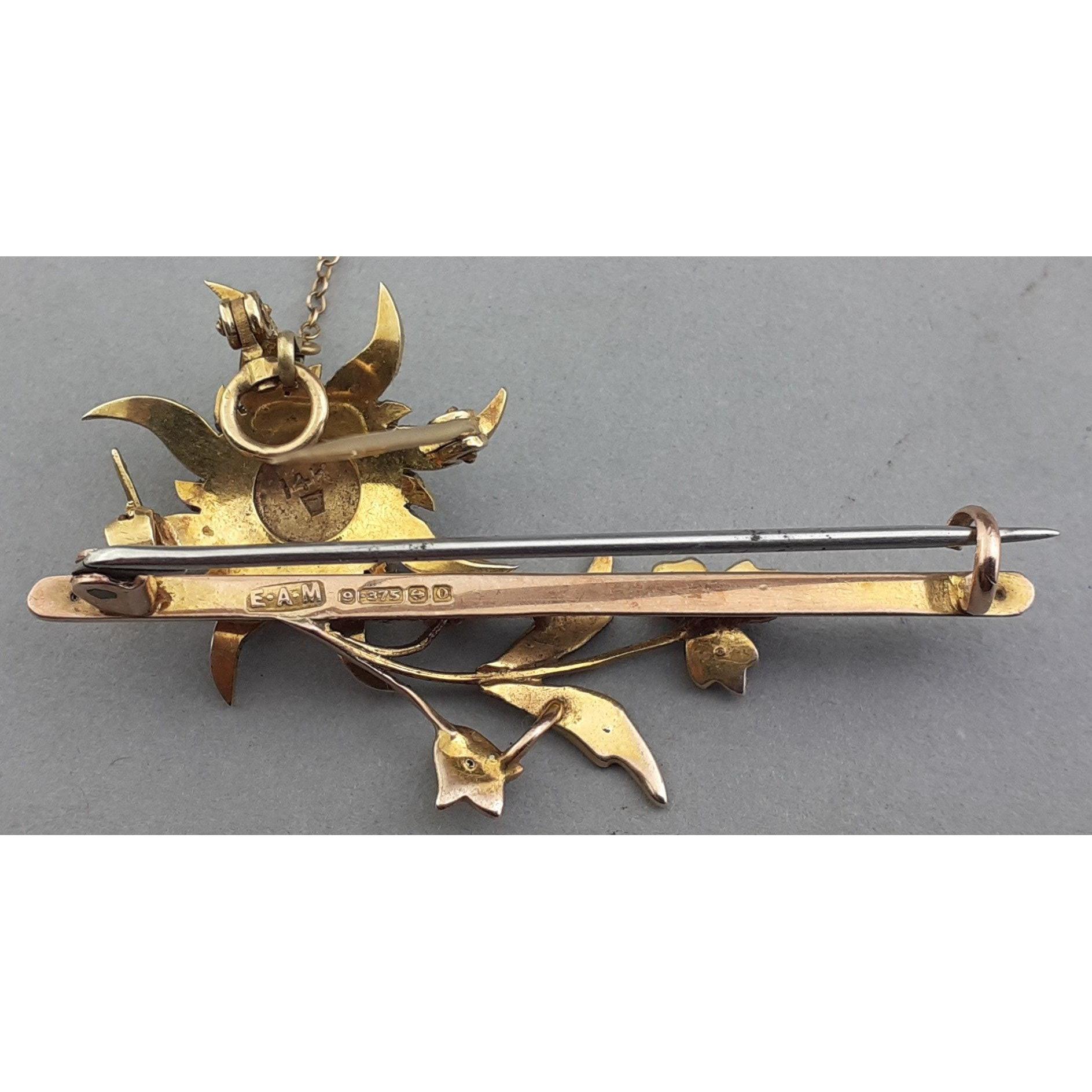 A 375 stamped brooch in floral form with seed pearls inset (with steel pin) gross weight and a 14K stamped small pin brooch in sun-form with tiny seed pearls inset gross weight 2.85g approx Approx 2 pieces