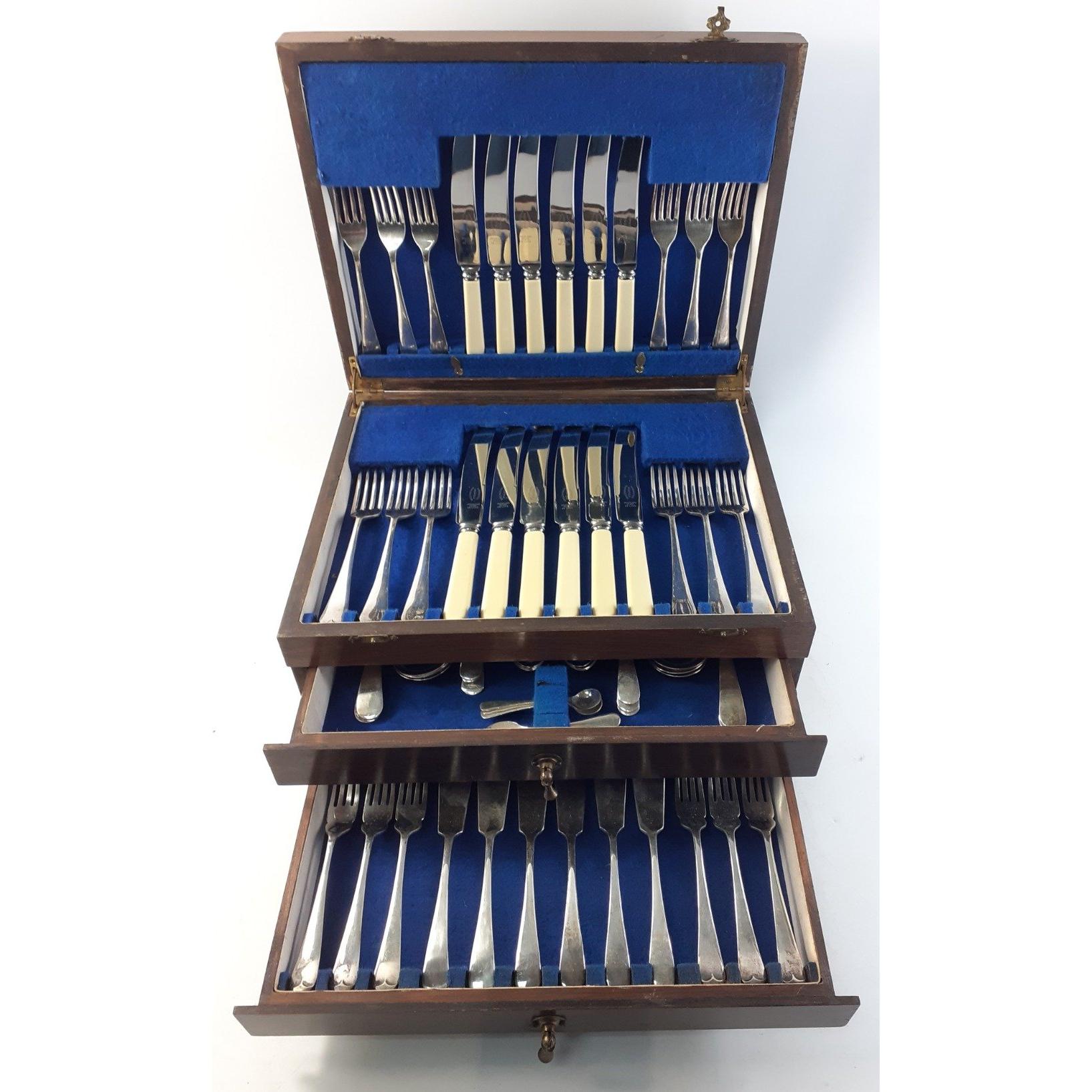 A three level wooden canteen of EPNS cutlery including fish knives and forks, mustard spoons etcApprox 1 pieces