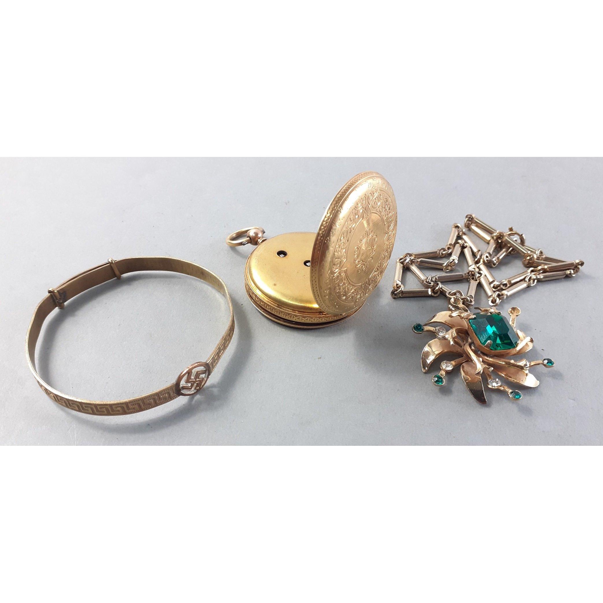An old pocket watch with a bangle with a good luck Swastika with a costume pendant and necklaceApprox 2 pieces