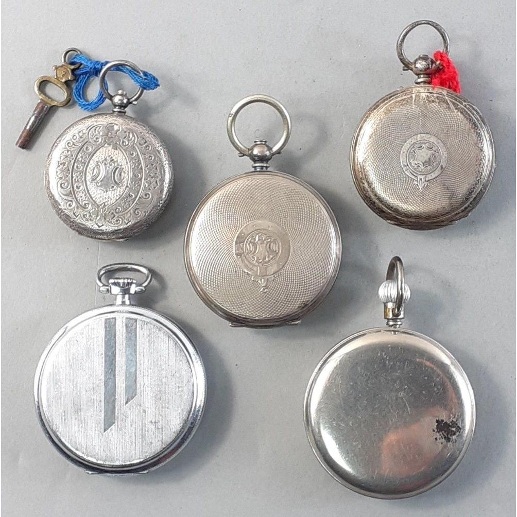 Five assorted pocket watches, non running To include Hendersons Jubilee, Siro and others one with 935 stamped case , and one with 800 stamped case.