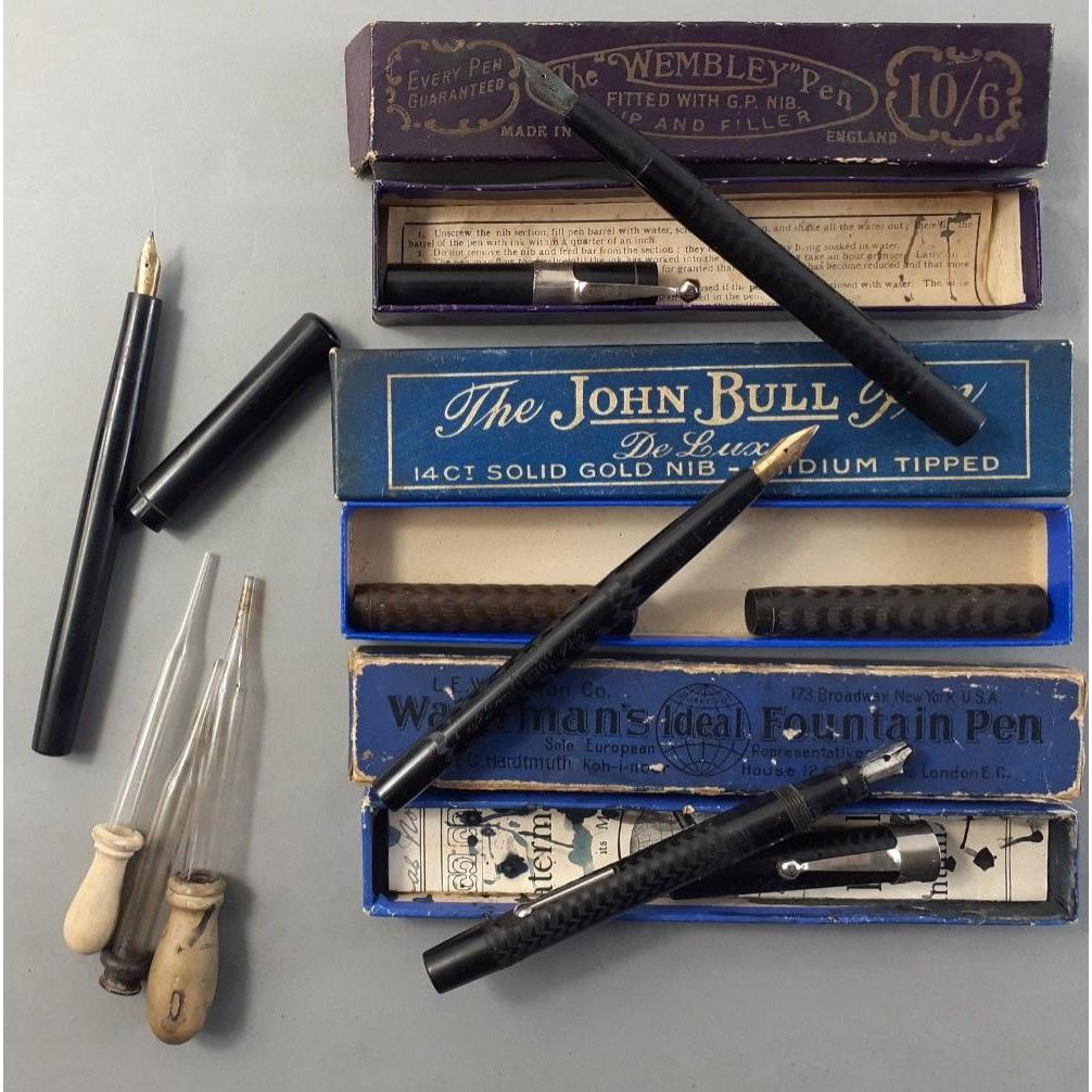 VINTAGE PENS. THE WEMBLEY PEN in box, THE JOHN BULL Pen in box, and a Watermans Pen box with dippers.
