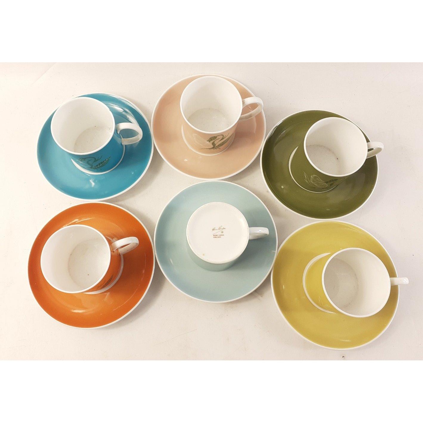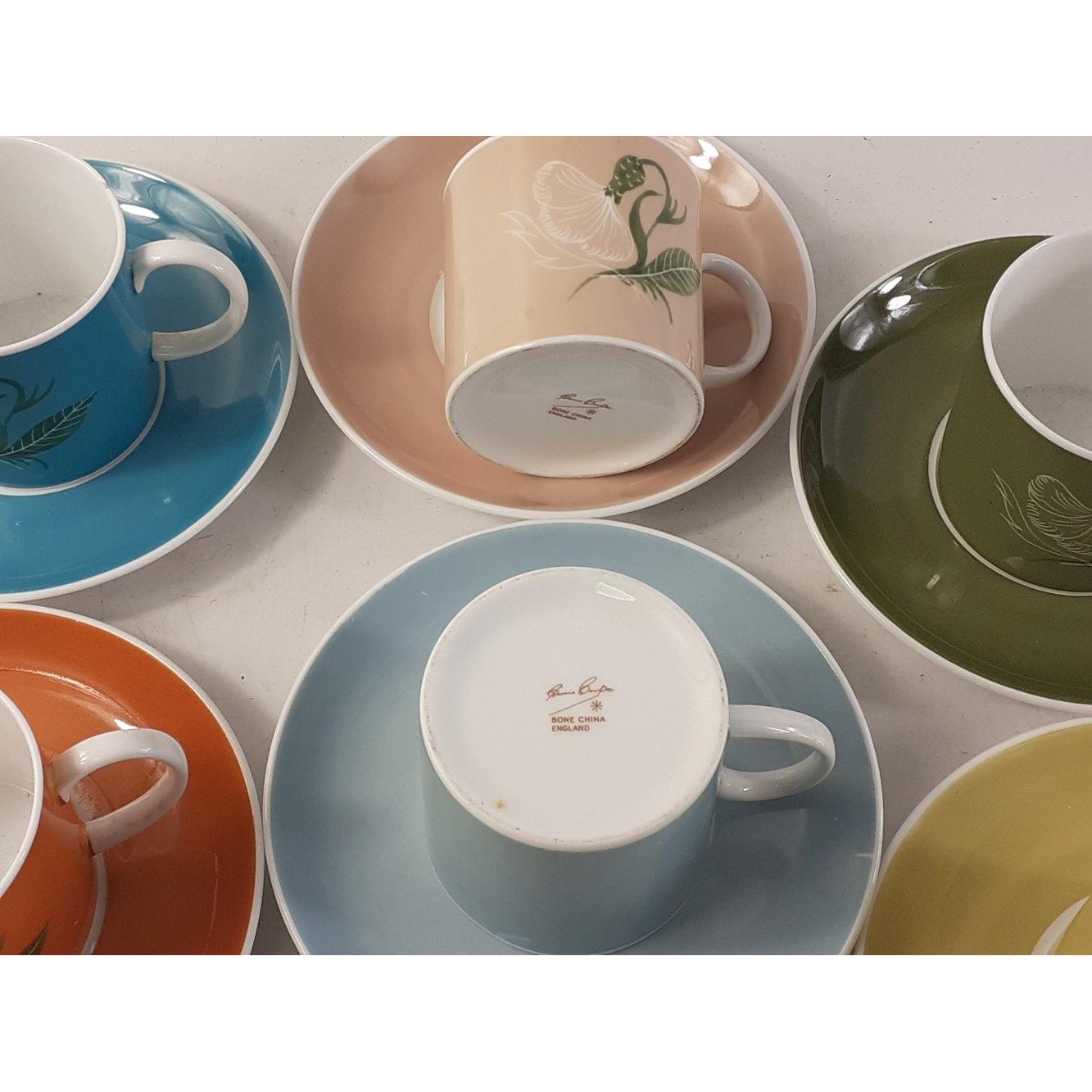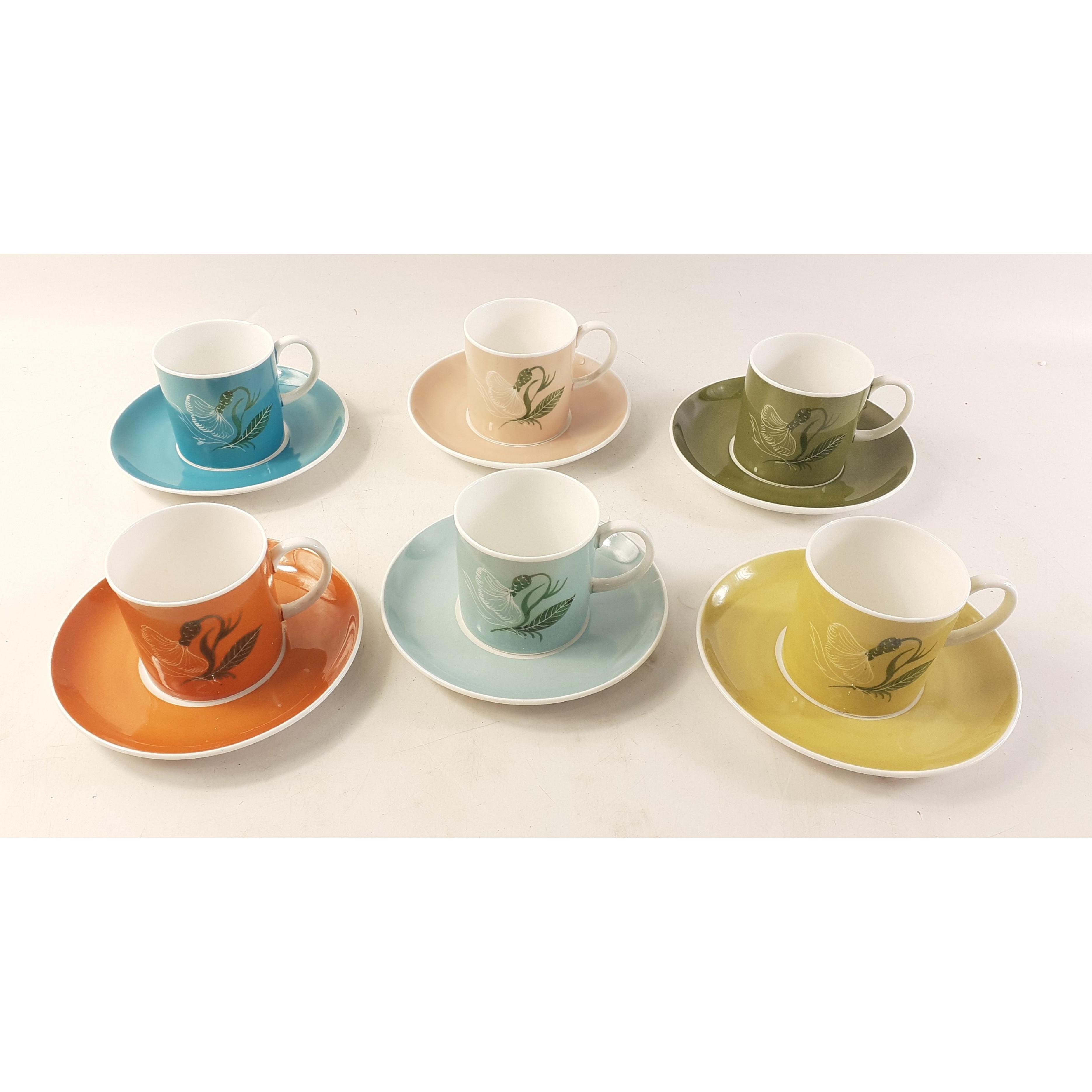SUSIE COOPER set of six coffee cans and saucers in pastel tones and floral design. Minor wear from use and a chip noted on the torquise coloured can. Approx 12 pieces