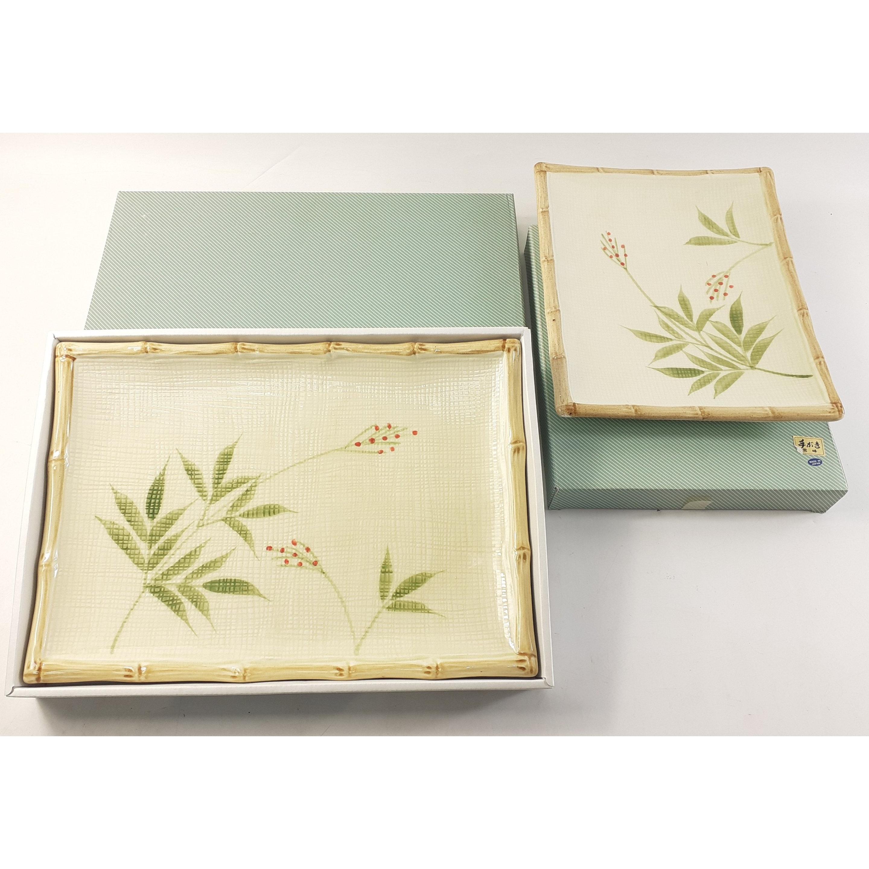 TWO JAPANESE BAMBOO THEMED ceramic serving dishes, the larger one 33cm x 23cm, the smaller 26cm x 20cm - both boxed probably unused judging by the conditionApprox 2 pieces