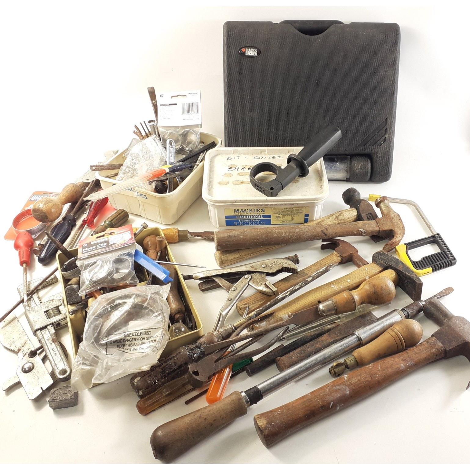 A large collection of vintage and worn hand tools to include hammers, pliers, chisels, drill bits. A boxed Black & Decker tool set. Good useful lot.