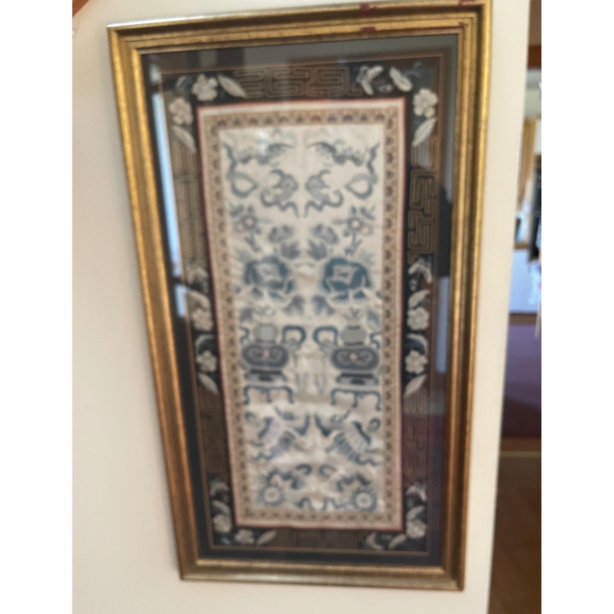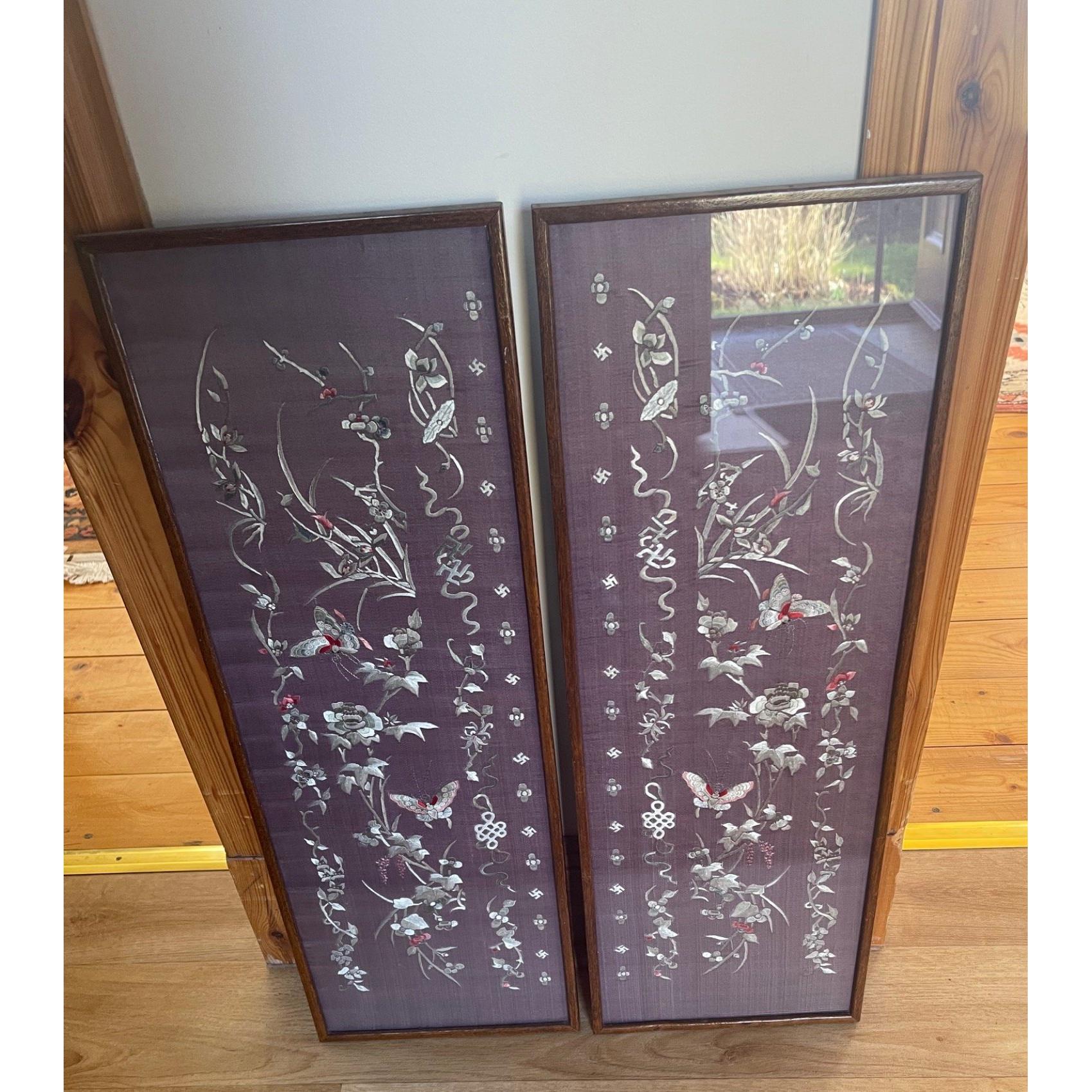 Three ORIENTAL SILK framed artworks - the pair are c1930's and are parts of a quality silk robe - dimensions the pair 65cm x 23cm and the larger 75cm x 43cm Approx 3 pieces