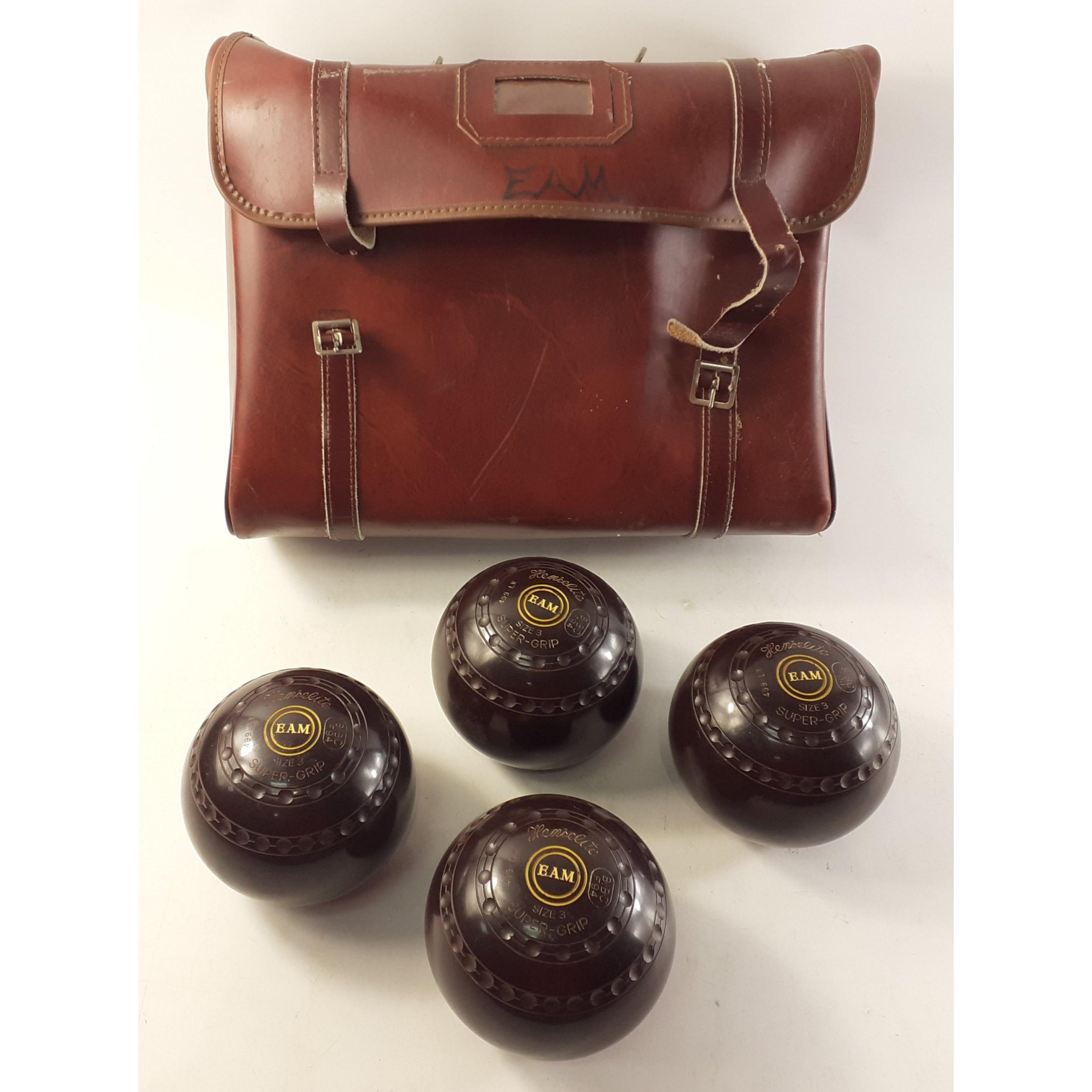 A cased set of HENSALITE size 3 lawn bowls in case, Initials EAM on bowls, case with wear.