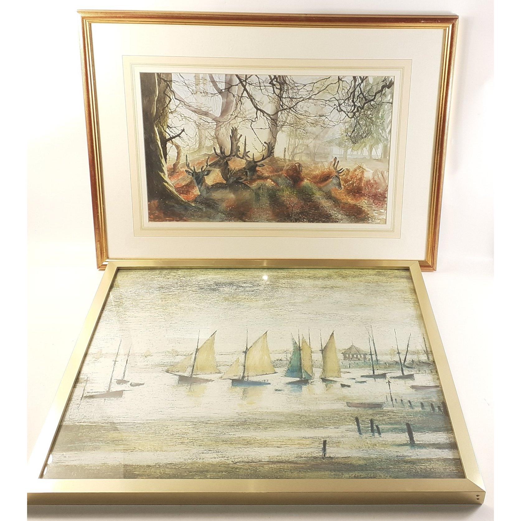 An appealing LOWRY print, 'Yachts at Lytham' 51 x 61cm. Also a countryside scene with DeerApprox 2 pieces