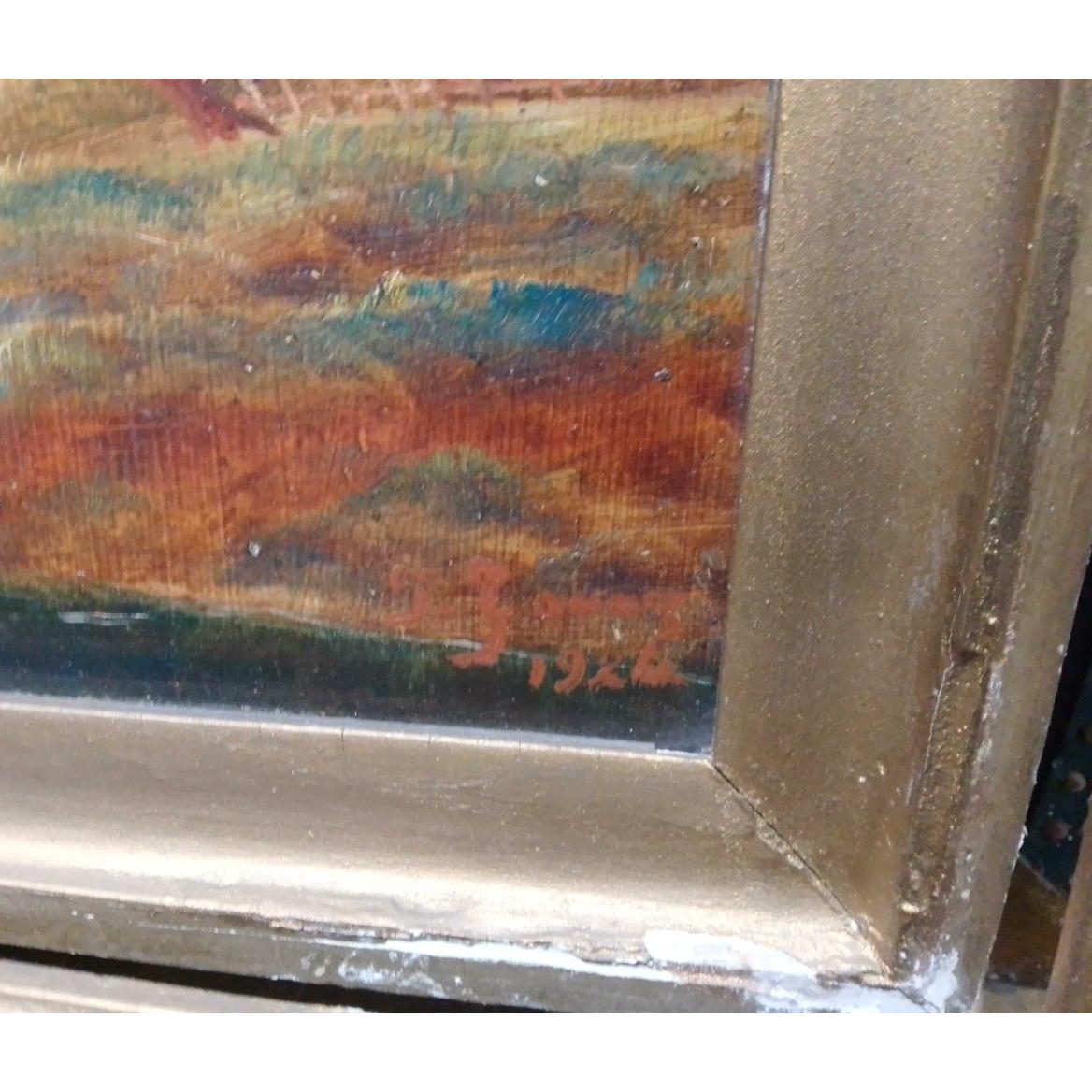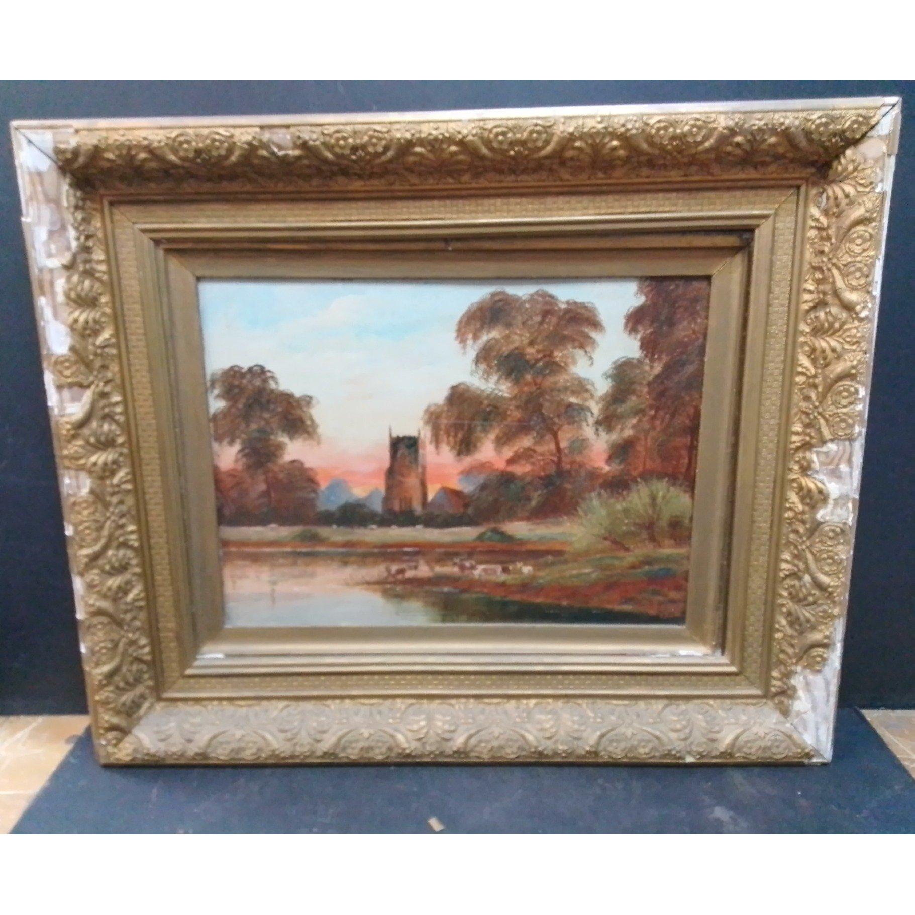 An attractive landscape painting of a church and cattle grazing close to the river. Indistinct signature - can make out J 1924. Light damage to the frame. Frame size 74cm x 60cm approximately