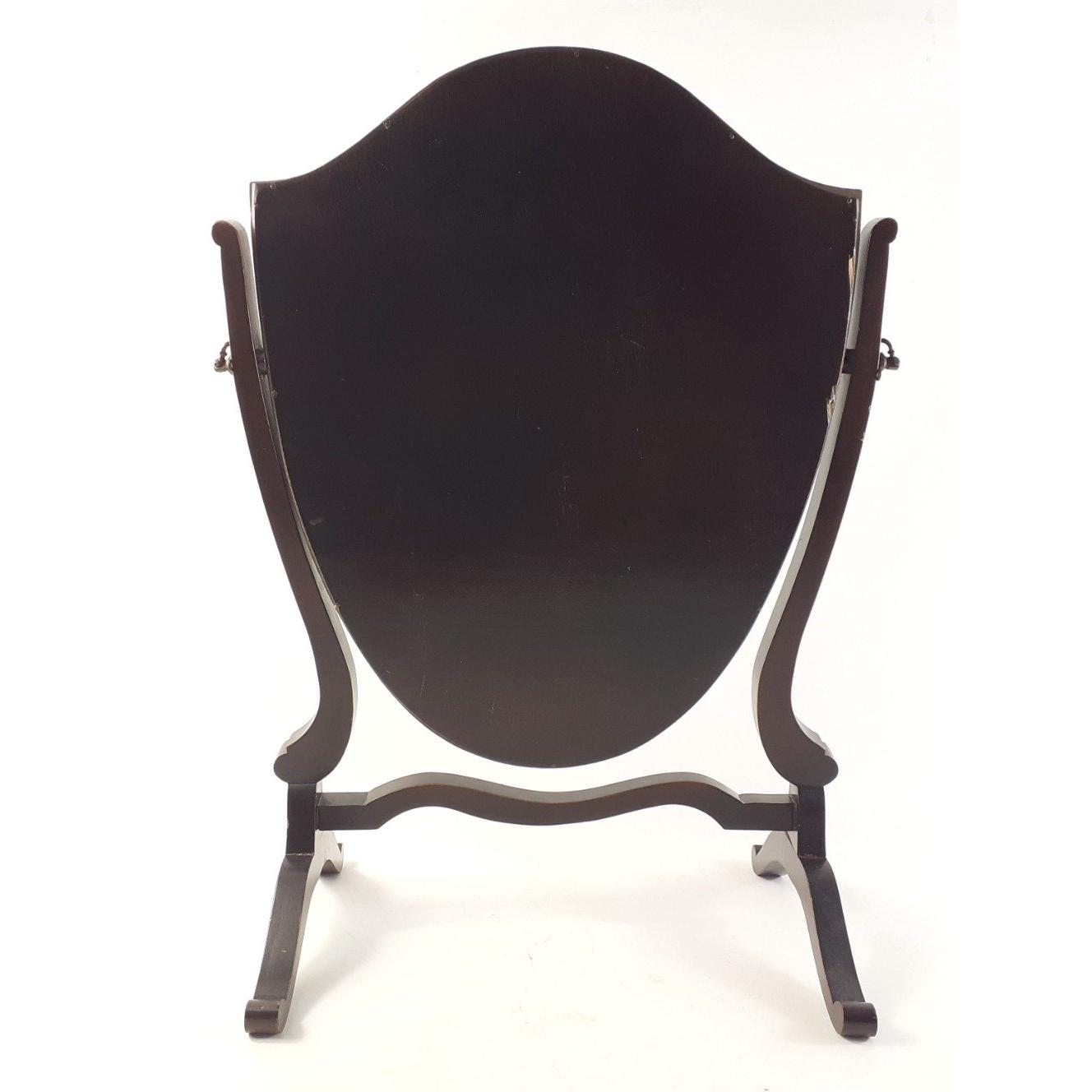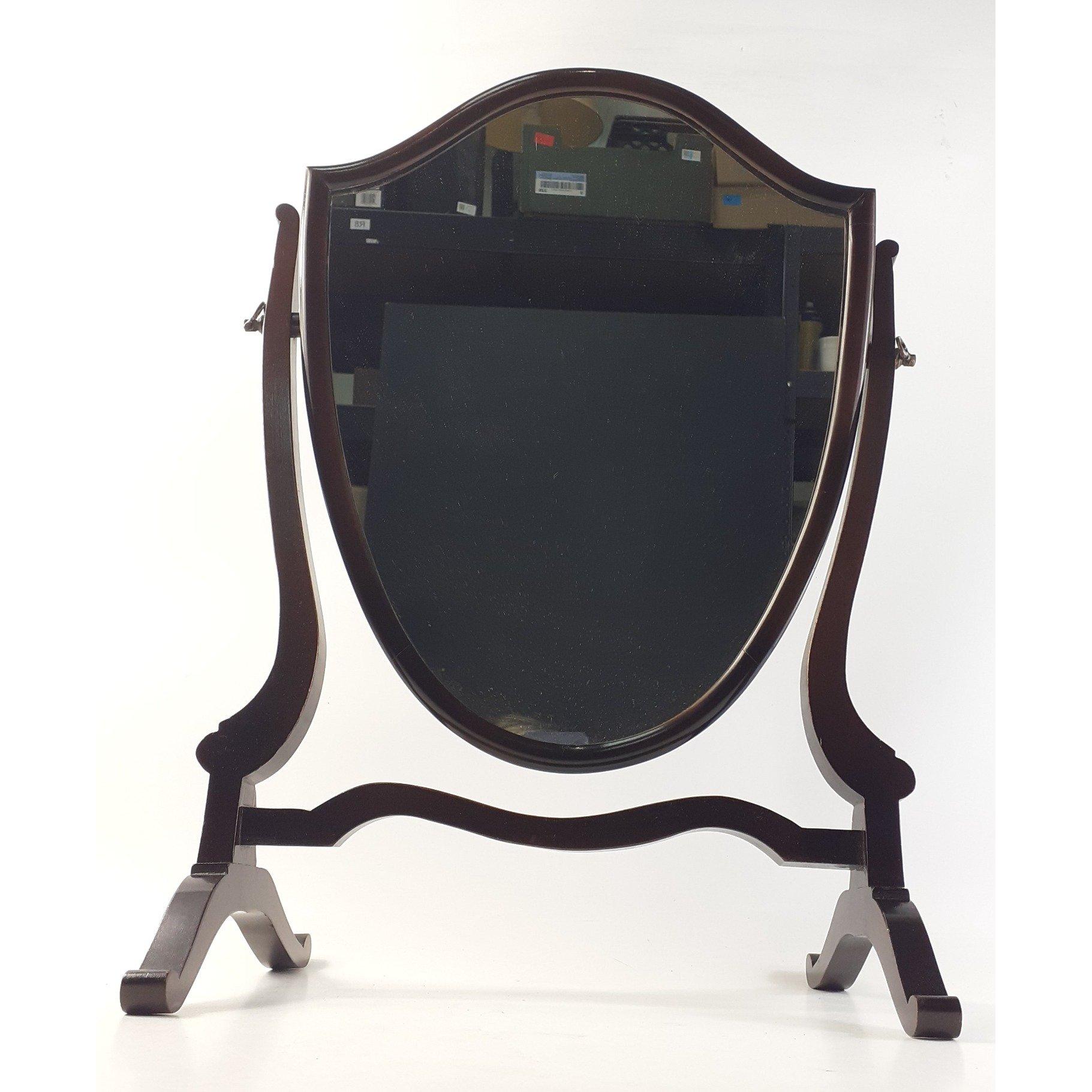 Antique shield shaped dressing mirror on swivel stand. 55cm tall approx.