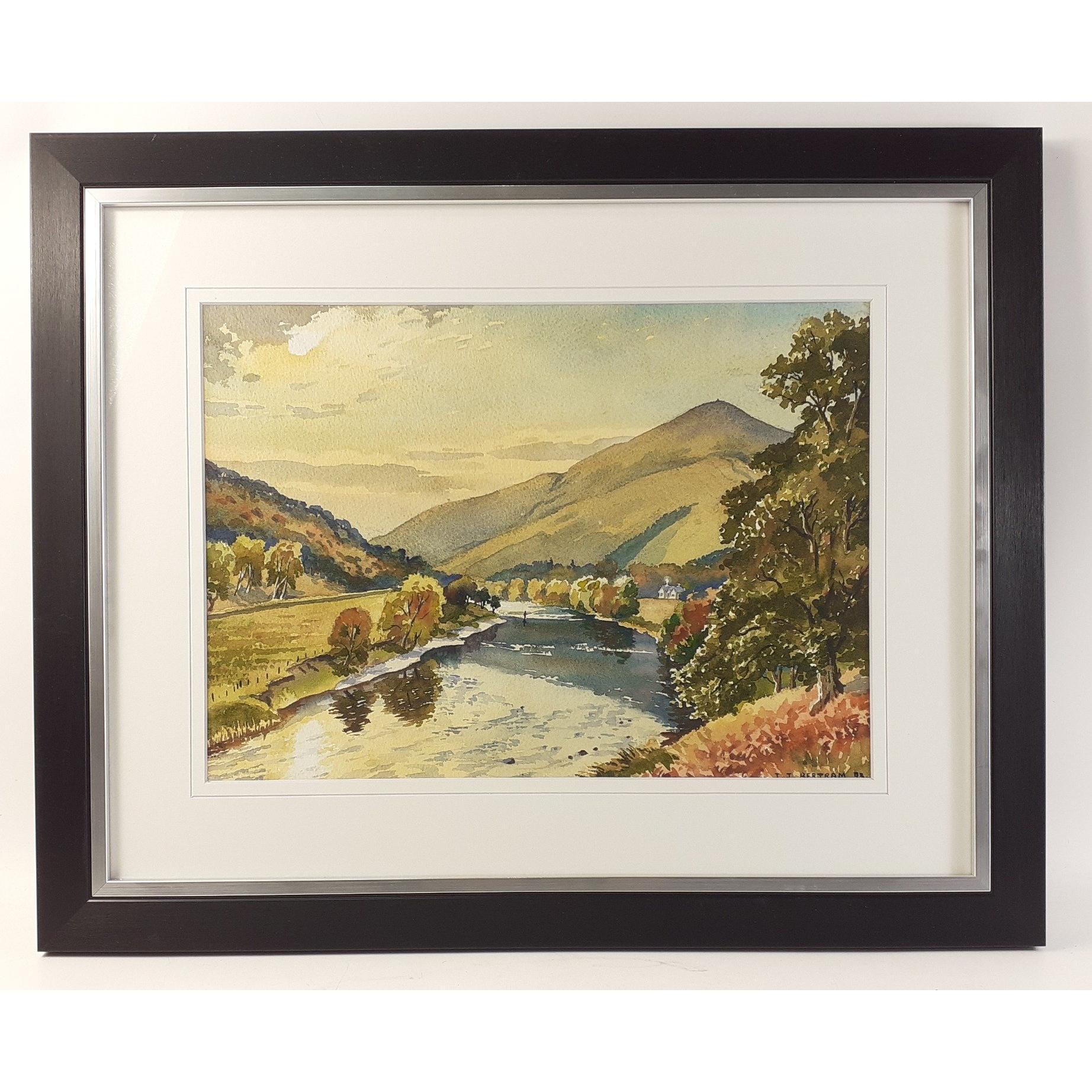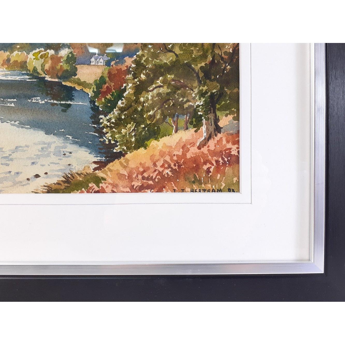 Local Border Artist T.J. BERTRAM Original watercolour. Fishing on the River Tweed WALKERBURN. Professionally framed. 55cm x 45cm approx.