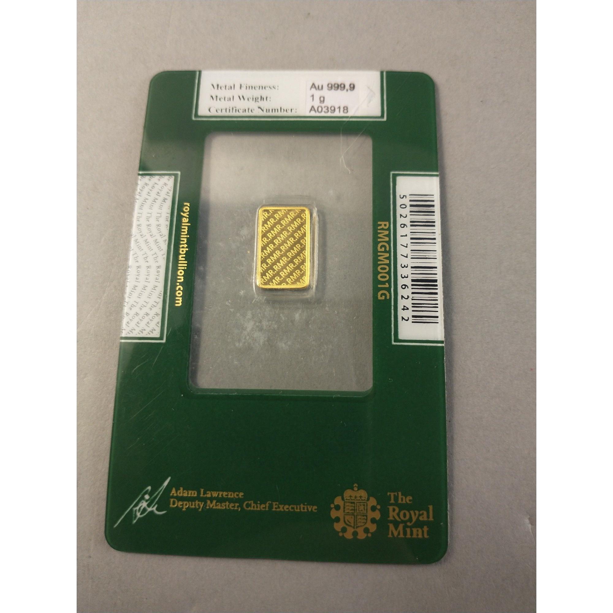 Lot 104 21st March 2025: Royal Mint sealed 1g .999 fine gold bar in pack.